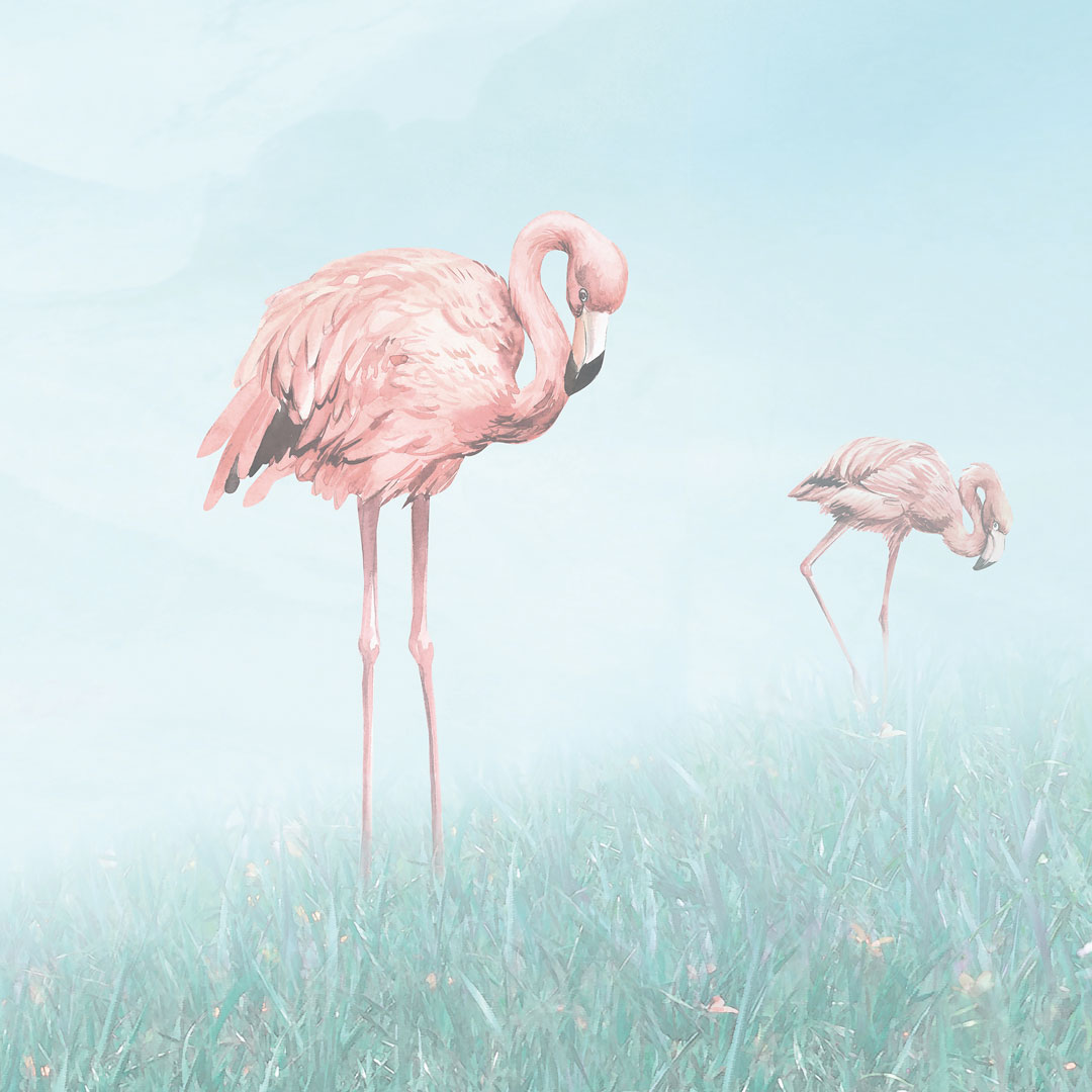 Dekoratívna tapeta na stenu vyhotovená v jemnom akvarelovom štýle. Ružové plameniaky prechádzajúce sa v hmle po zelenej a tyrkysovej lúke. Scénu dotvárajú listnaté konáre stromov. Ideálna do obývačky, spálne alebo detskej izby.