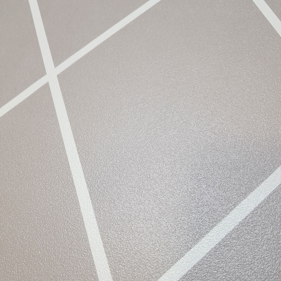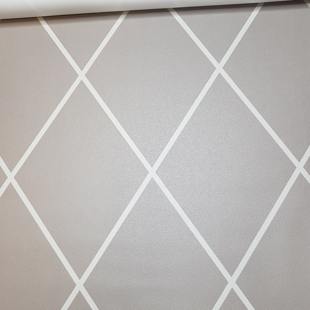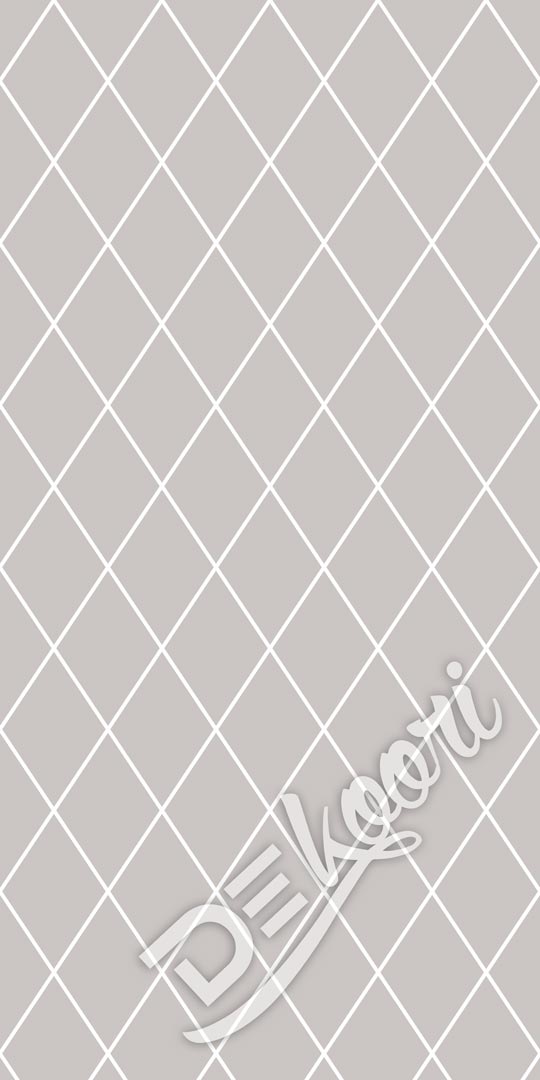 Moderná tapeta v sivobéžovej (gréžovej) farbe so vzorom: kosoštvorcová sieť z bielymi obrysmi, kontúrami obrazcov.