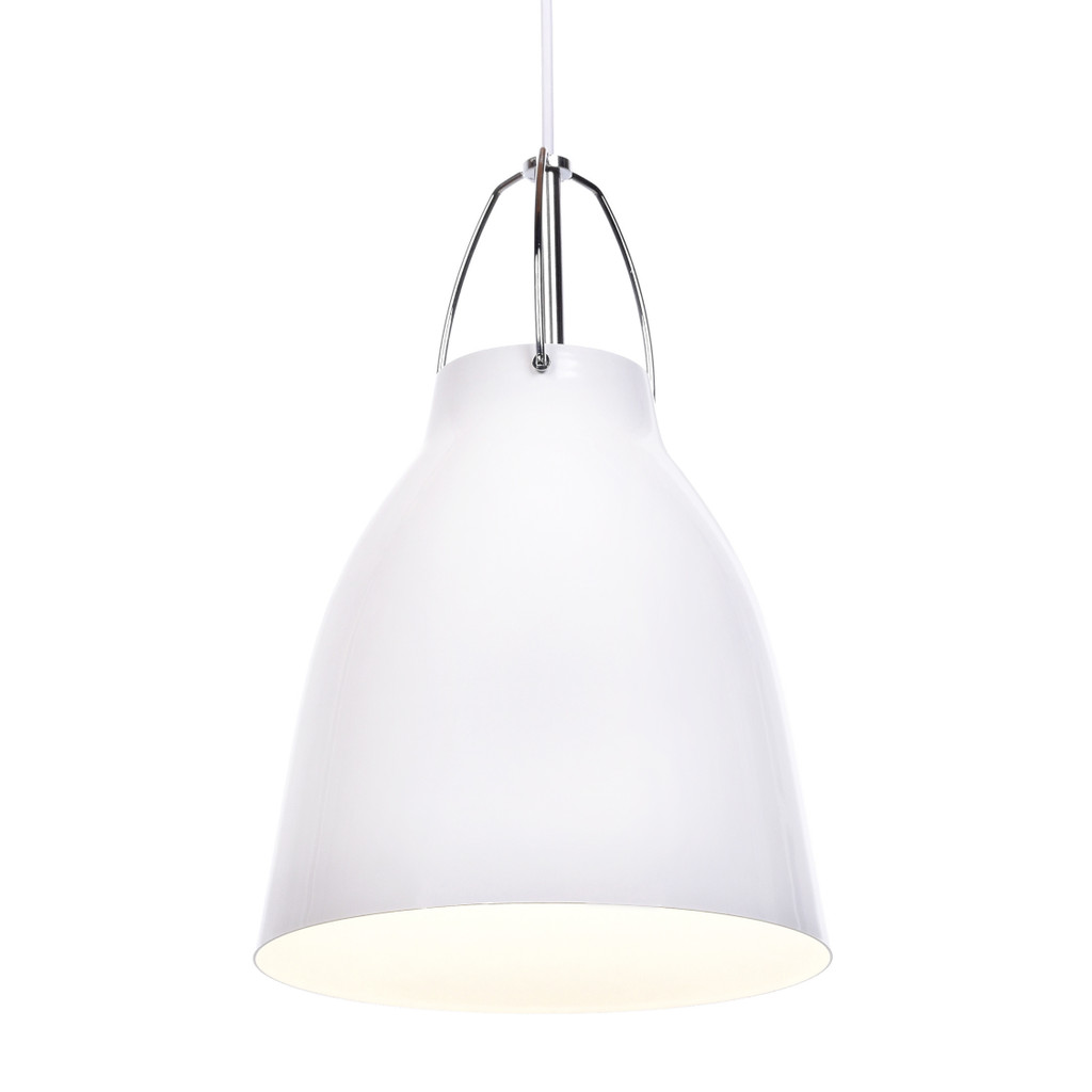 Biele moderné závesné svietidlo, škandinávsky loftový luster RAYO s kovovým tienidlom. Rovnako dobre sa hodí do škandinávskeho a loftového štýlu, ako aj pre priemyselný štýl.