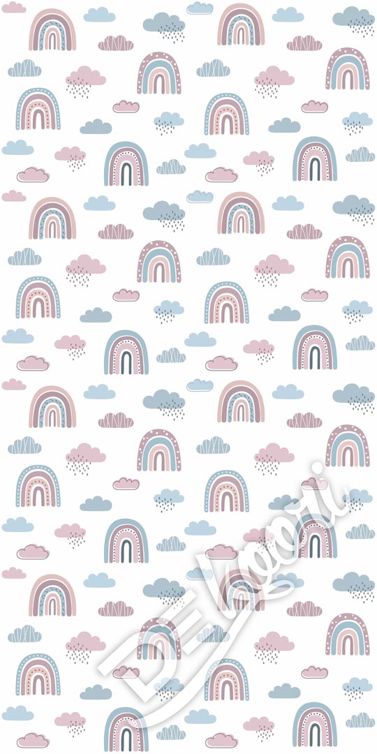 Jemná, magická tapeta na stenu vyhotovená v pastelových odtieňoch ružovej a modrej s dúhou a dažďovými oblakmi na bielom pozadí!