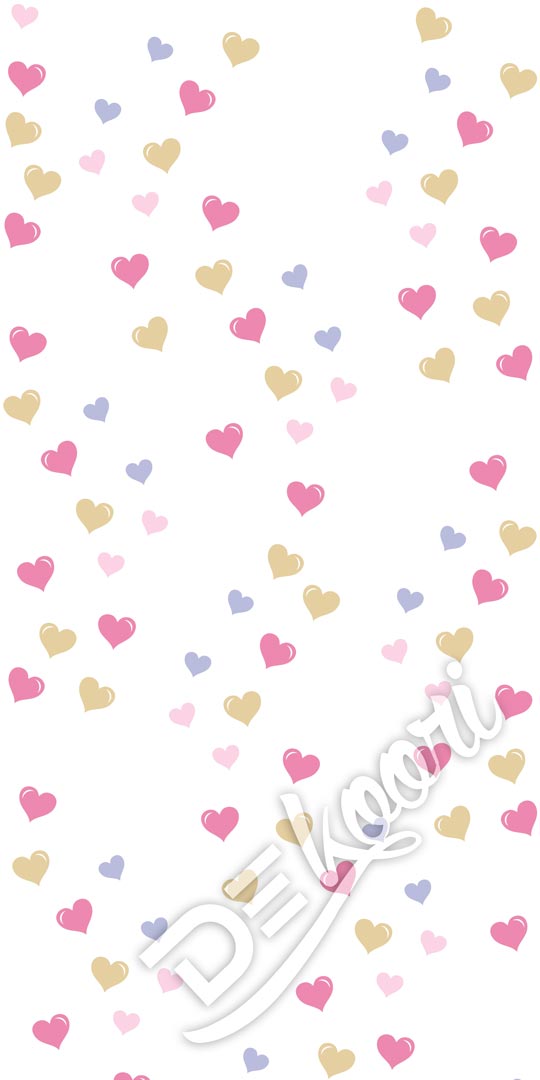 Rozkošná farebná tapeta pre deti, ideálne do dievčenskej izby. Biele pozadie a tmavoružové, béžové, svetloružové a svetlofialové srdiečka v dvoch veľkostiach. Tapeta je umývateľná a dá sa použiť v ktorejkoľvek miestnosti.