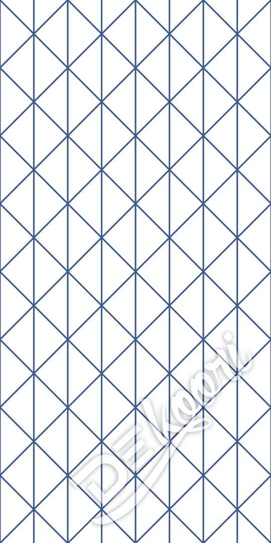 Unikátna biela nástenná tapeta s moderným vzorom – trojuholníky a línie, v trendovej farbe Classic Blue. Táto farba bola vybraná značkou PANTONE ako farba roku 2020. Tapeta je ideálna pre obývaciu izbu, rovnako ako pre spálňu alebo kuchyňu.