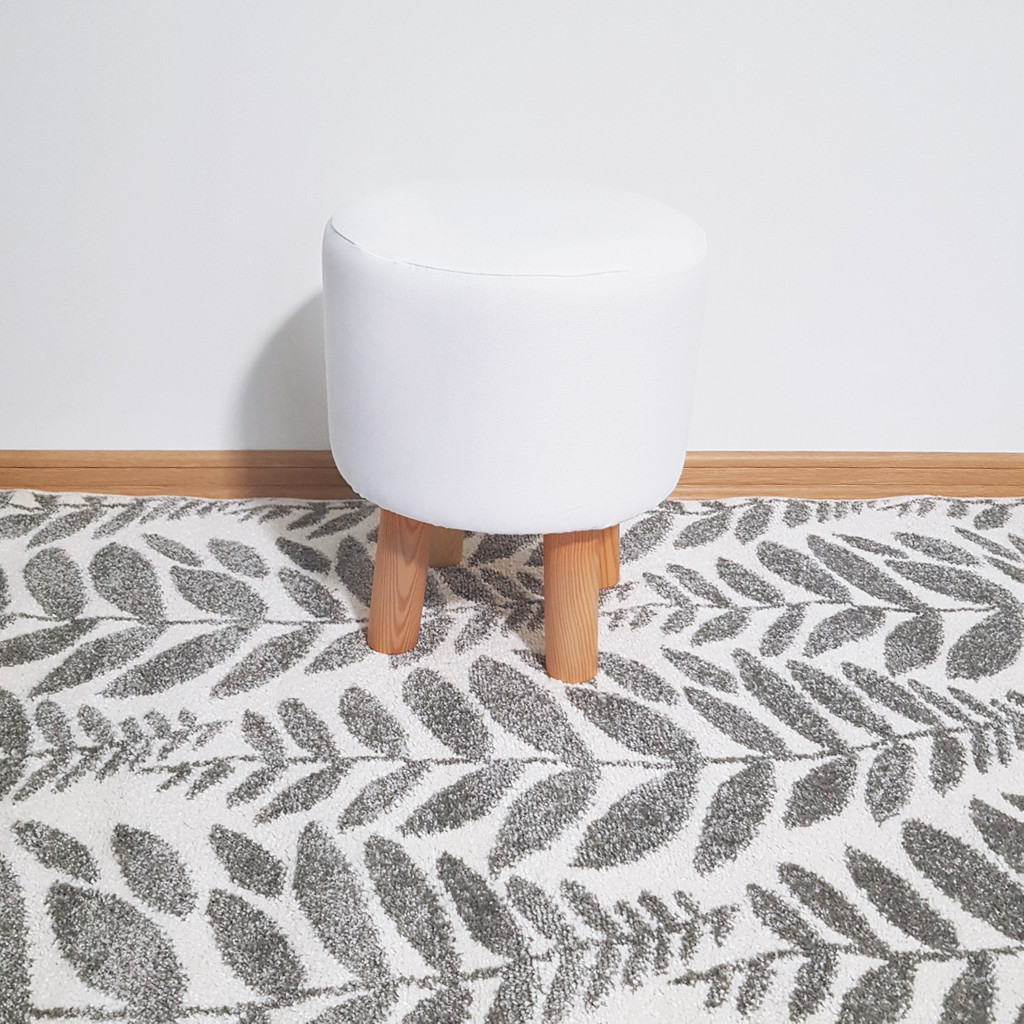 Krásny biely puf, škandinávska stolička. Má drevené nohy, pohodlné, okrúhle sedadlo a odnímateľný, hladký, jednofarebný poťah v bielej farbe. Je to taburetka vhodná do obývacej izby, spálne alebo do iných miestností. Uplatní sa v interiéroch zariadených v škandinávskom štýle. Na výber je nízky alebo vysoký stolček.
