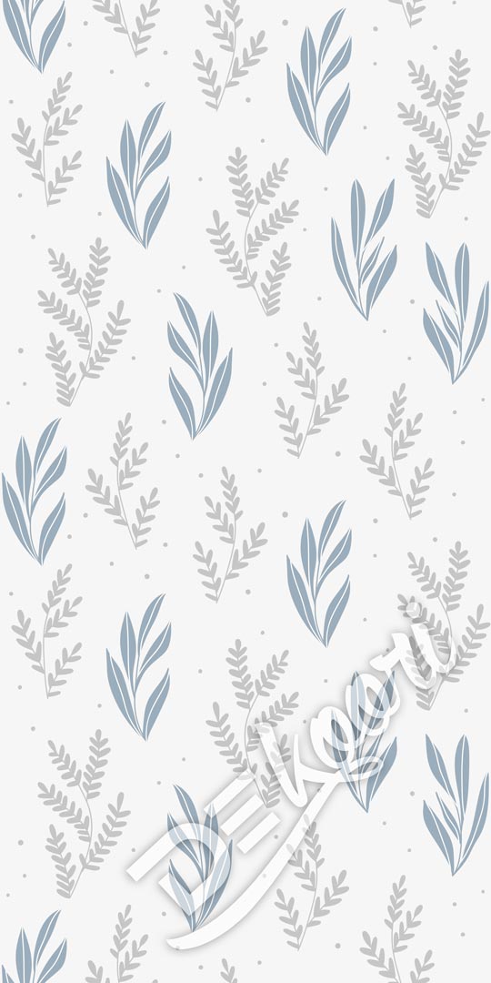 Svetlosivá tapeta s modrými a sivými vodnými rastlinami, morskými riasami. Botanický vzor prezentovaný na pozadí malých bodiek v modernom štýle. Ideálna pre obývaciu izbu, spálňu, jedáleň alebo aj čakáreň.
