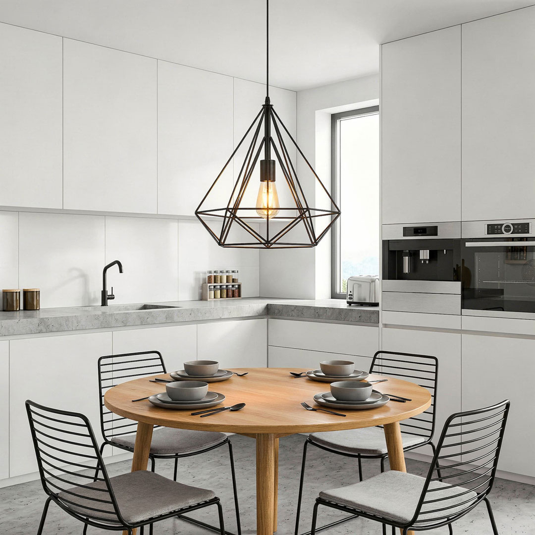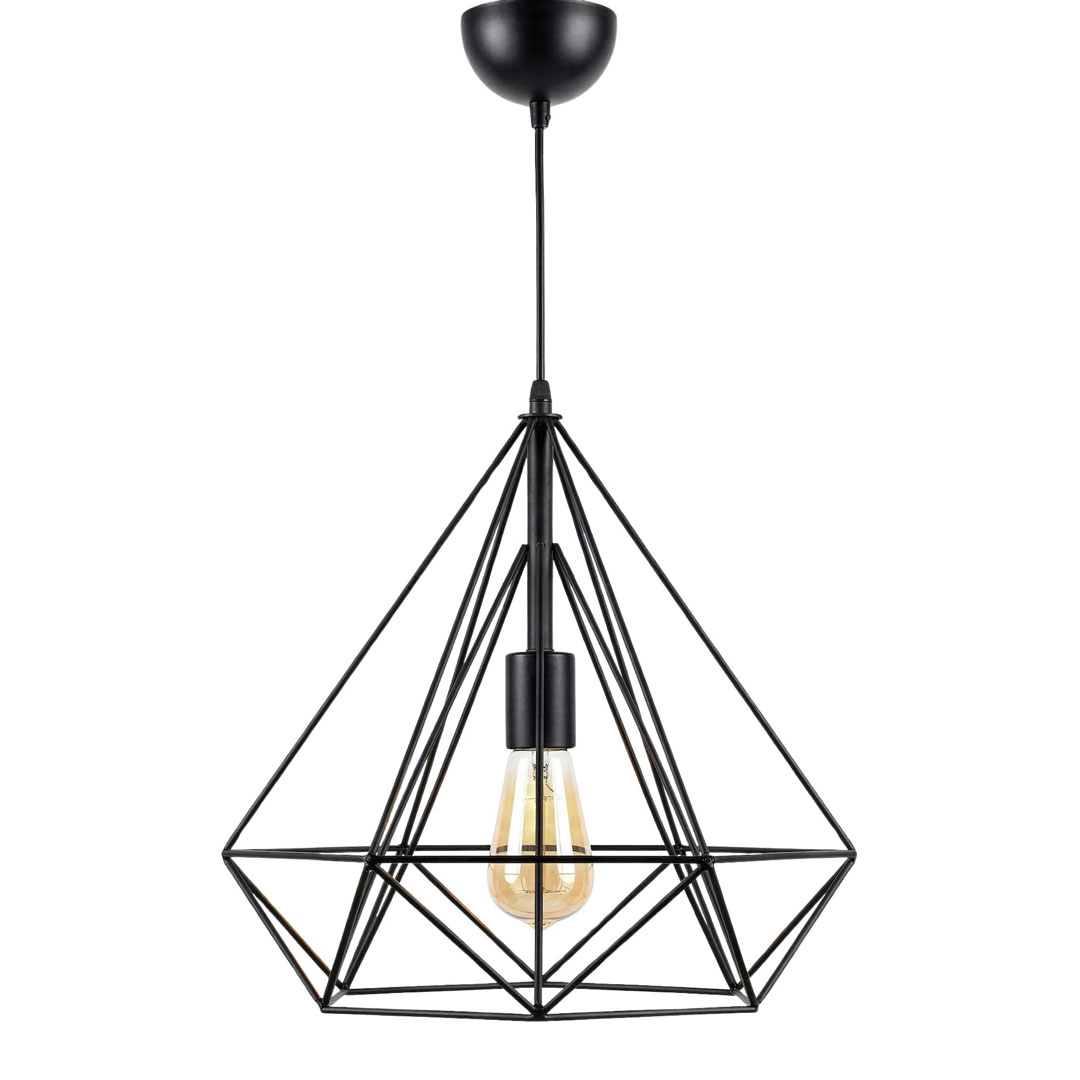 Minimalistické čierne drôtené závesné svietidlo v tvare diamantu, ktoré zodpovedá priemyselnému aj škandinávskemu štýlu, rovnako loftovým priestorom. Kovová mriežka je z drôtu a tienidlo z bielej textílie.