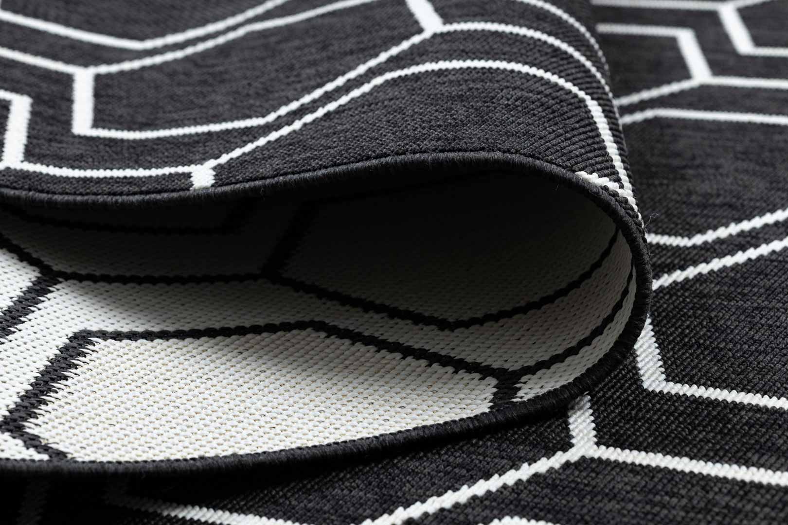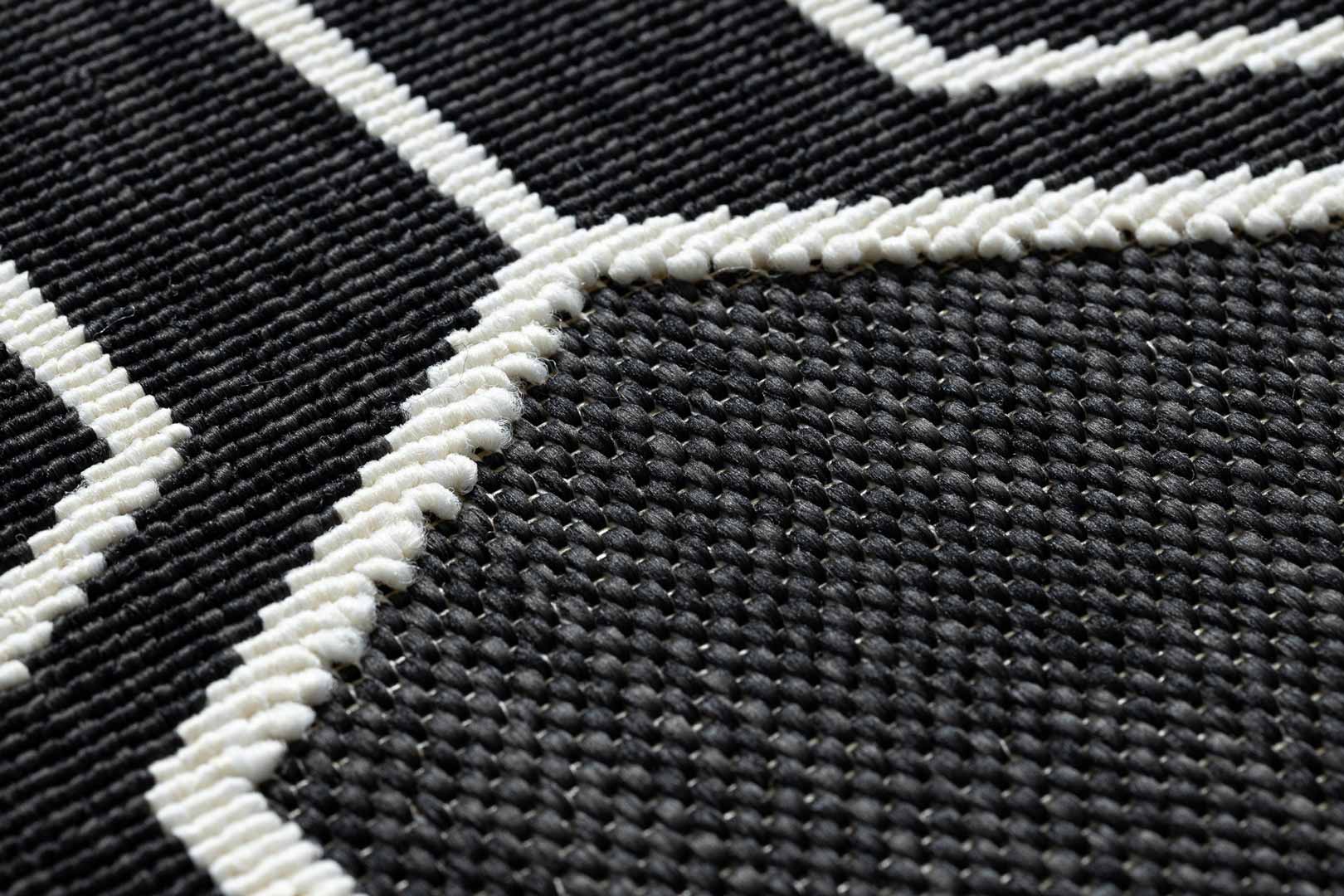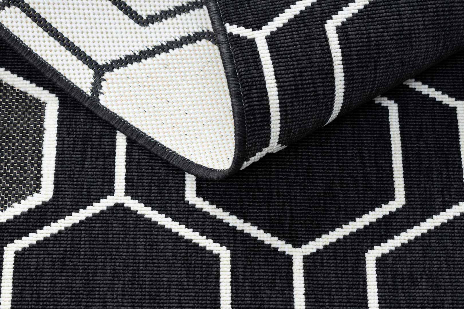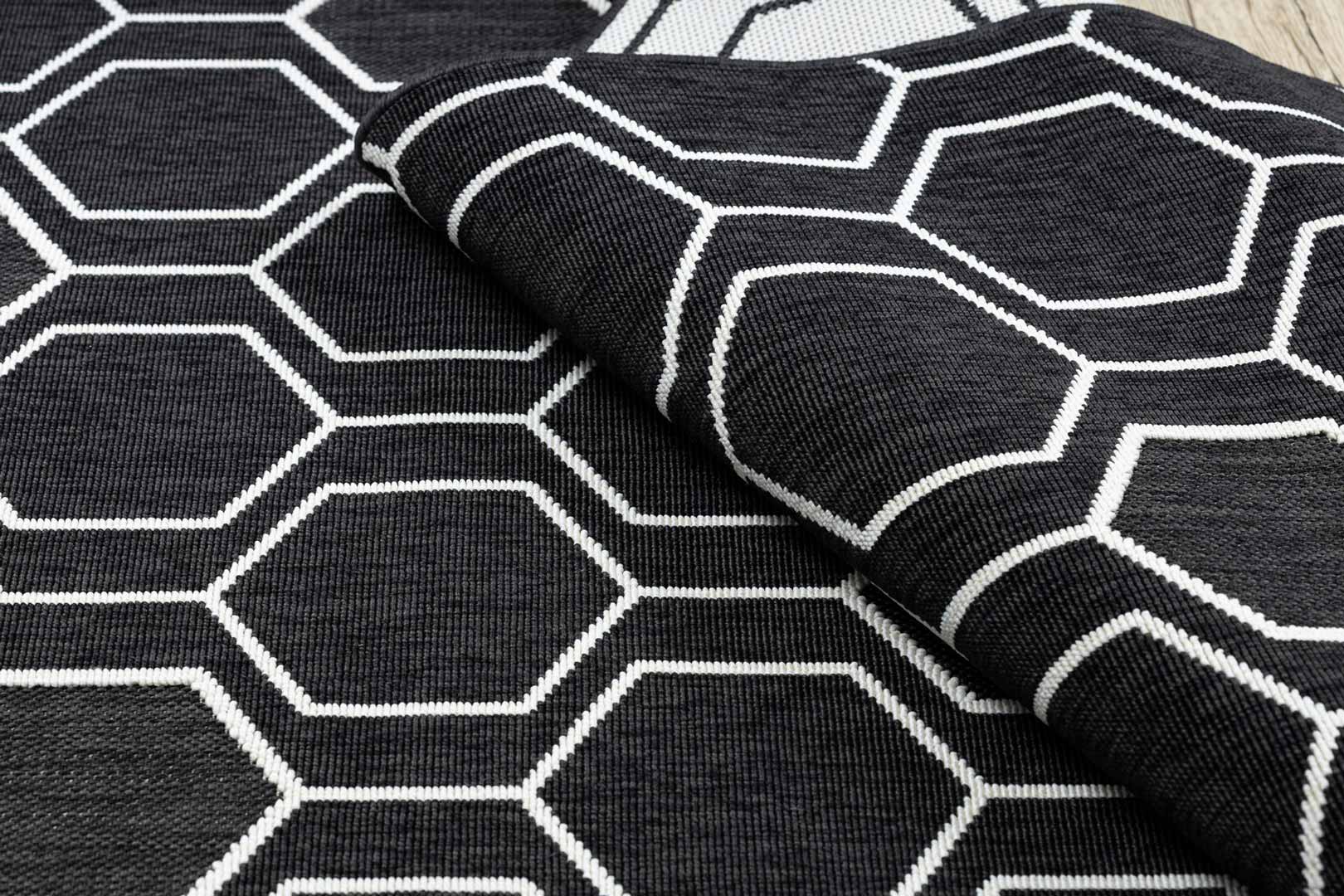 Tento čierny koberec s geometrickým vzorom šesťuholníkov v bielej farbe bude veľmi atraktívnym doplnkom kancelárie alebo domácnosti, loftu či škandinávskeho interiéru, ktorý potrebuje osviežiť. Materiál použitý na výrobu tohto výrobku umožňuje jeho použitie aj v exteriéri - na balkónoch alebo terasách. Okrem toho, aj vďaka technike výroby pomocou šnúrok a smyčiek, vytvára bariéru proti vode, špine, chlpom domácich zvierat a ponúka jednoduché odstraňovanie nečistôt. Zaručuje preto trvanlivosť na dlhé roky.