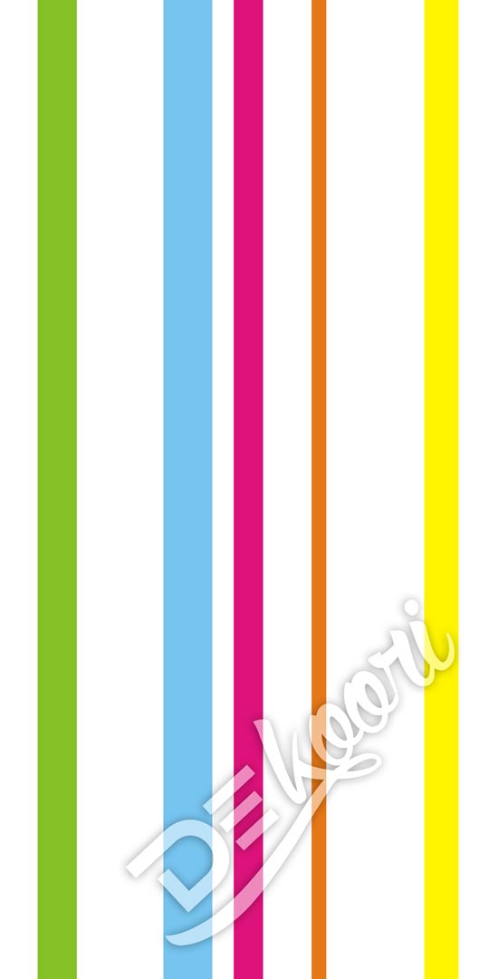 Moderná, farebná dekoračná tapeta so zvislými pruhmi v piatich farbách: zelená, modrá, ružová, oranžová, žltá. Módny odľahčený dizajn.