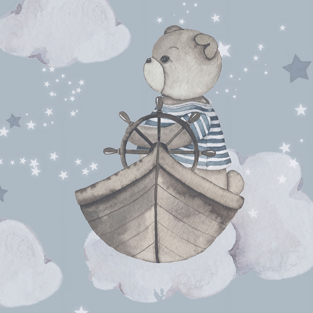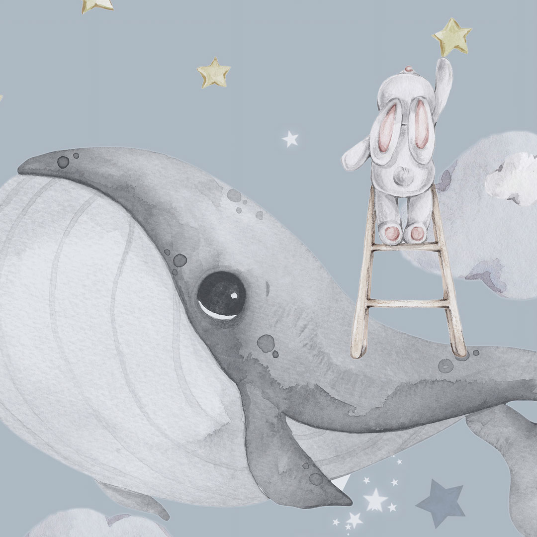 Krásna detská tapeta do chlapčenskej alebo dievčenskej izby - lov na hviezdy. Pastelovo modré pozadie (špinavá modrá) a akvarelové sivé a hnedé detaily. Na rozprávkovej scéne sú zobrazené veľryby a lietajúce zvieratá medzi oblakmi. Naši hrdinovia, roztomilé zvieratká, skúmajú každý kúsok pastelovej oblohy. Veľryby plávajú a hľadajú dobrodružstvo. Medvede námorníci sa plavia na lodiach a ďalekohľadom hľadajú jasné hviezdy. Zajace a králiky chytajú hviezdy priamo z lietajúceho balóna alebo ich zbierajú stojac na rebríku. Ľadový medveď sa hojdá na mesačnej hojdačke, líška sa hrá s balónmi a čajka odpočíva na oblaku. Viete si predstaviť rozkošnejšiu scénu? Sme si istí, že v tejto spoločnosti bude každé dieťatko šťastné.