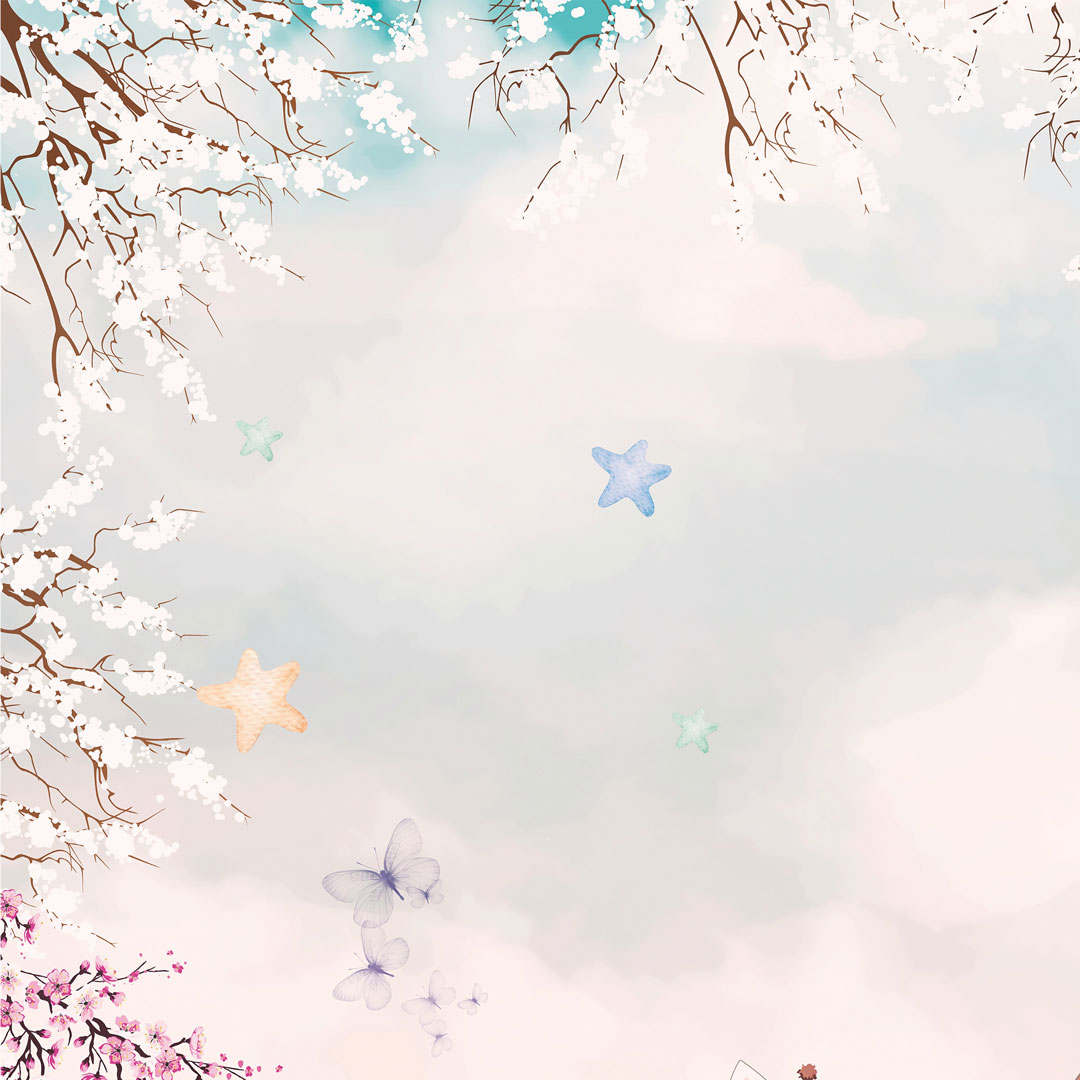 Roztomilá detská tapeta - prechádzka po lane. Naše zvieratá: žirafa, panda, medveď, slon predvádzajú cirkusové triky v oblakoch na modrej oblohe. Scénu dopĺňajú rozkvitnuté čerešne, kvety, hviezdy, vtáky a motýle. Boli použité pastelové odtiene modrej, ružovej a lososovej farby.