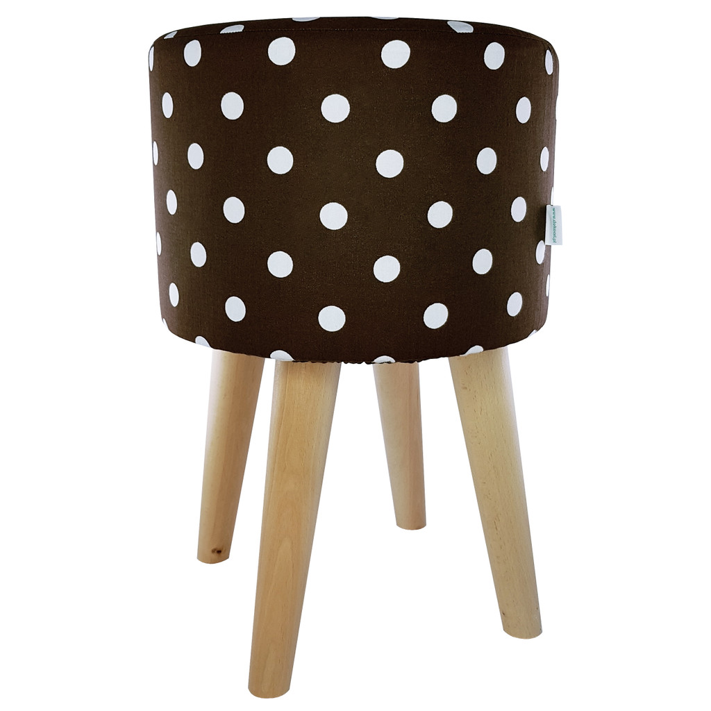 Drevená taburetka s mäkkým, hnedo-bielym, čokoládovým sedadlom s bodkovaným vzorom, bodky polka dot.