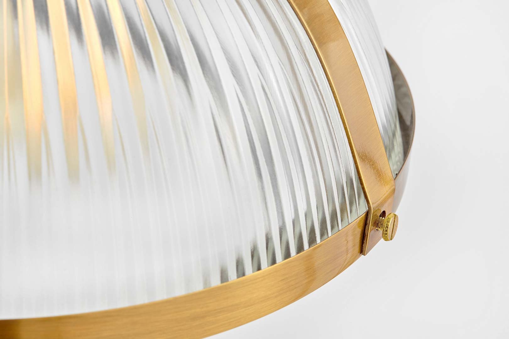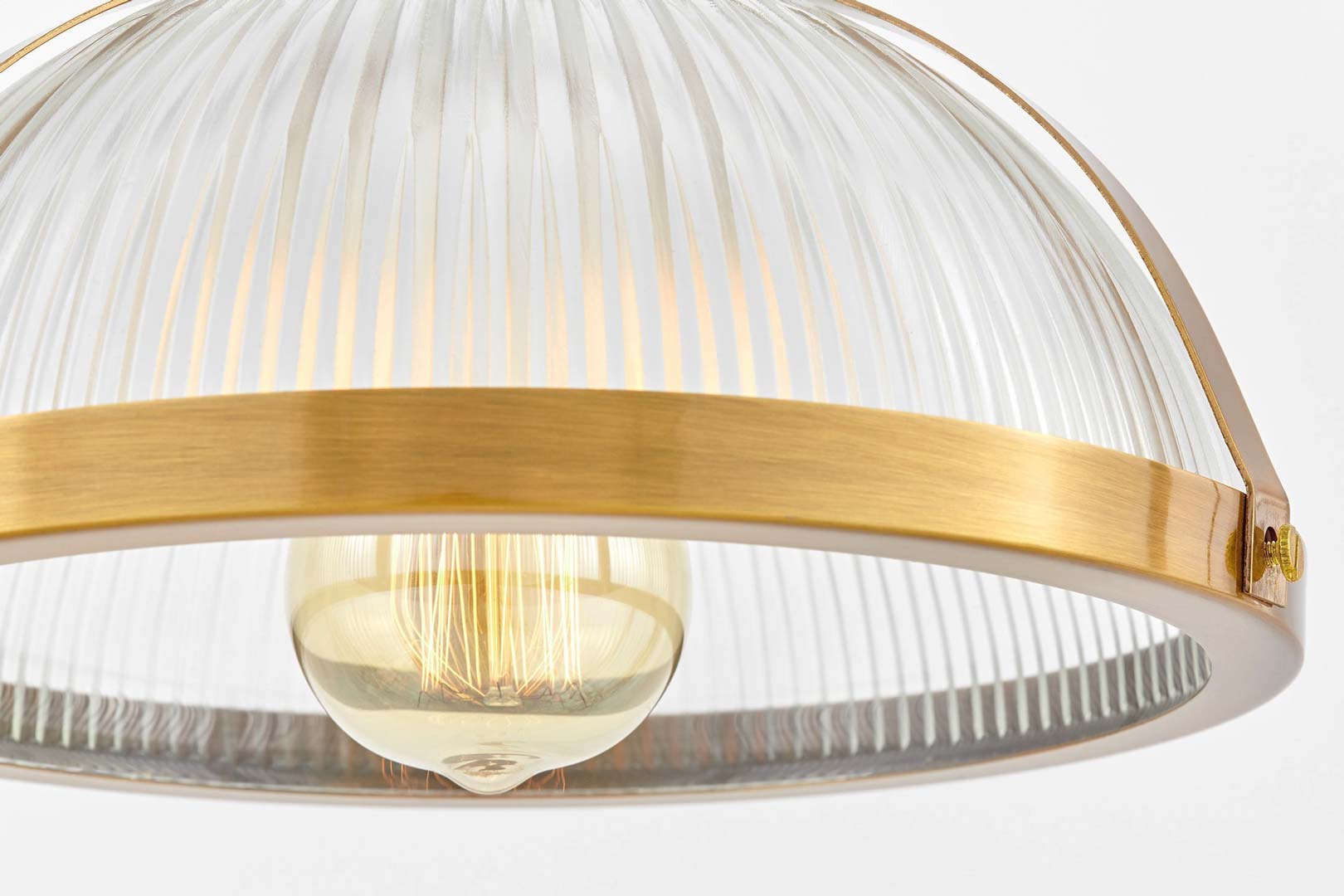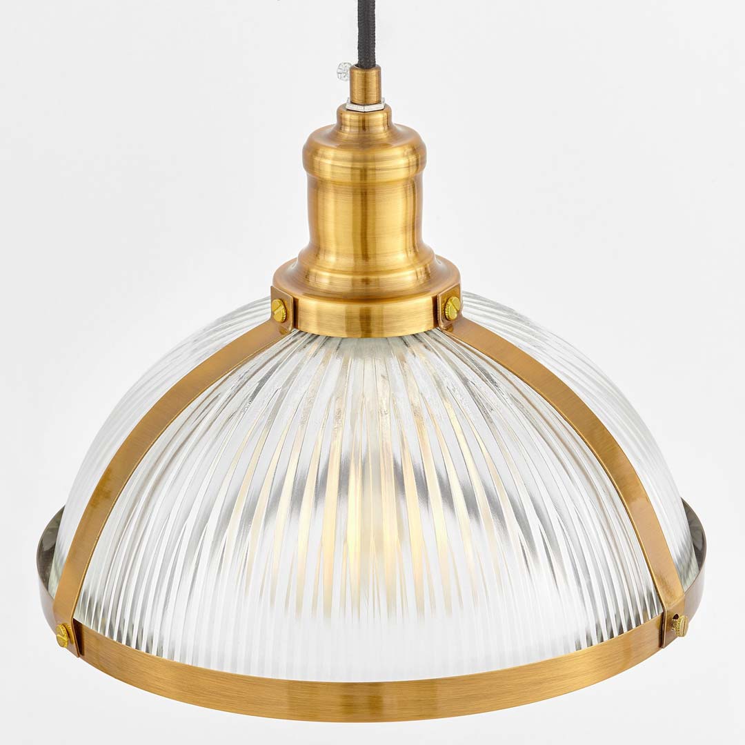 Moderné sklenené závesné svietidlo BRICO v tvare kupoly s mosadznými prvkami. Zodpovedá industriálnemu štýlu. Hodí sa do kuchyne, jedálne aj do úžitkových priestorov.