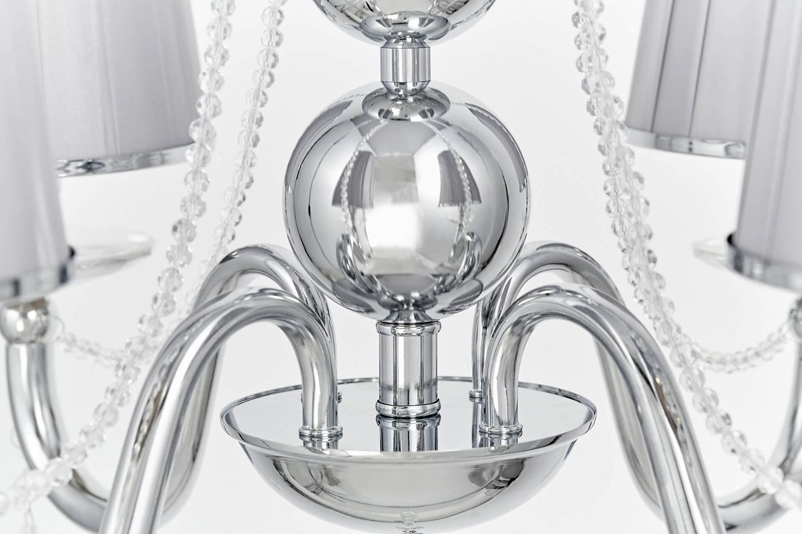 Dekoratívny klasický luster FABIONE W4 vyrobený z chrómovaného kovu a krištáľových ovesov najvyššej kvality. Štvorbodové svietidlo má tienidlá vyrobené z textílie.