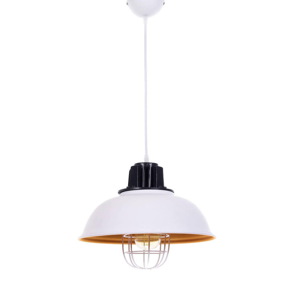 Závesná lampa FUKO v retro štýle. Loftové svietidlo v bielej farbe s čiernymi a medovými, jantárovými prvkami. Je kovové a zavesené na nastaviteľnom kábli. Bude skvele vyzerať v obývacej izbe, nad jedálenským kútom alebo v kuchyni.