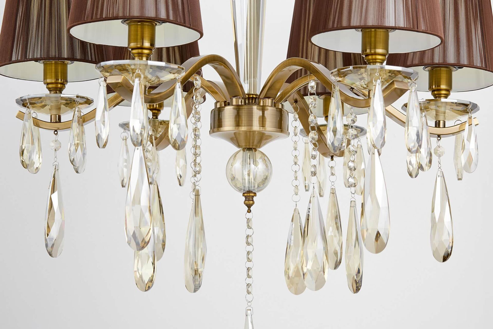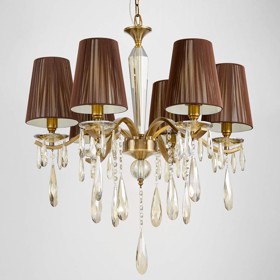 Šesťramenný krištáľový luster mosadznej farby, štýlový ALESSIA W6 zavesený na nápadnej reťazi. Módny luster osadzuje šesť bronzových tienidiel. Vyrobený v univerzálnom štýle, z kovu a zdobený kryštálmi najvyššej kvality.