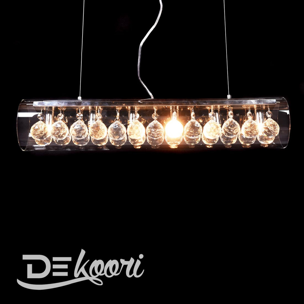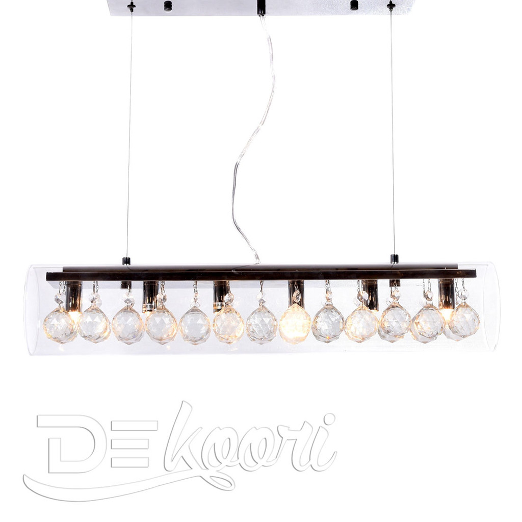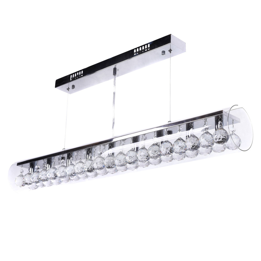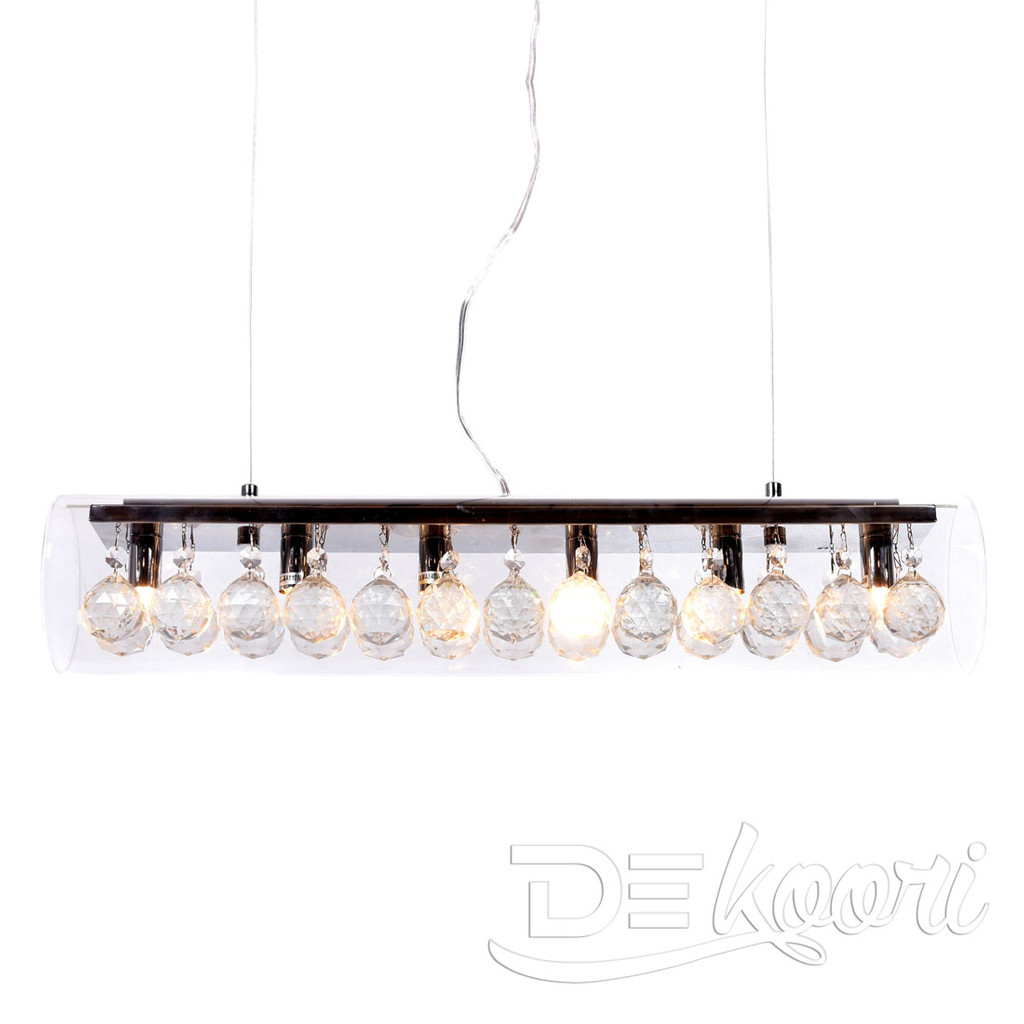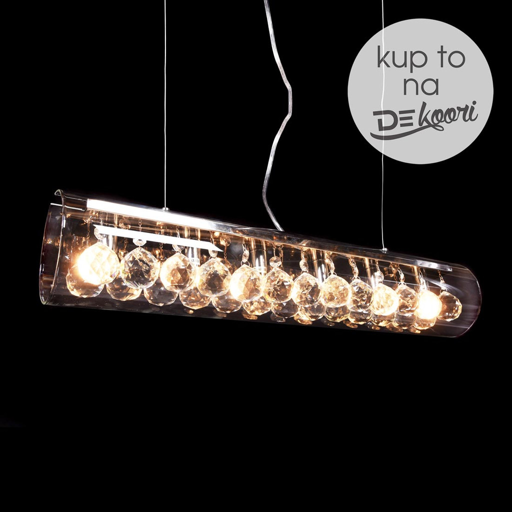 Moderná sklenená závesná lampa BRIZA s kryštálmi najvyššej kvality, skleneným priehľadným tienidlom v tvare horizontálnej trubice a kovovou stropnou lištou. Vyberte si z dvoch veľkostí.
