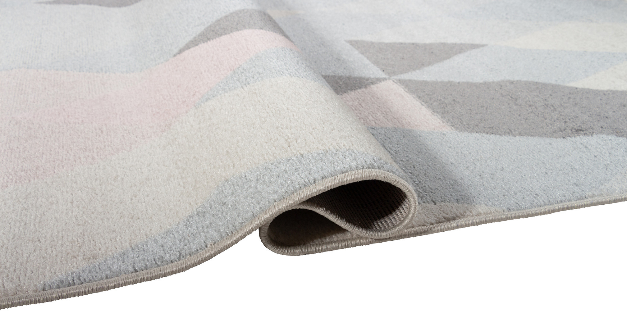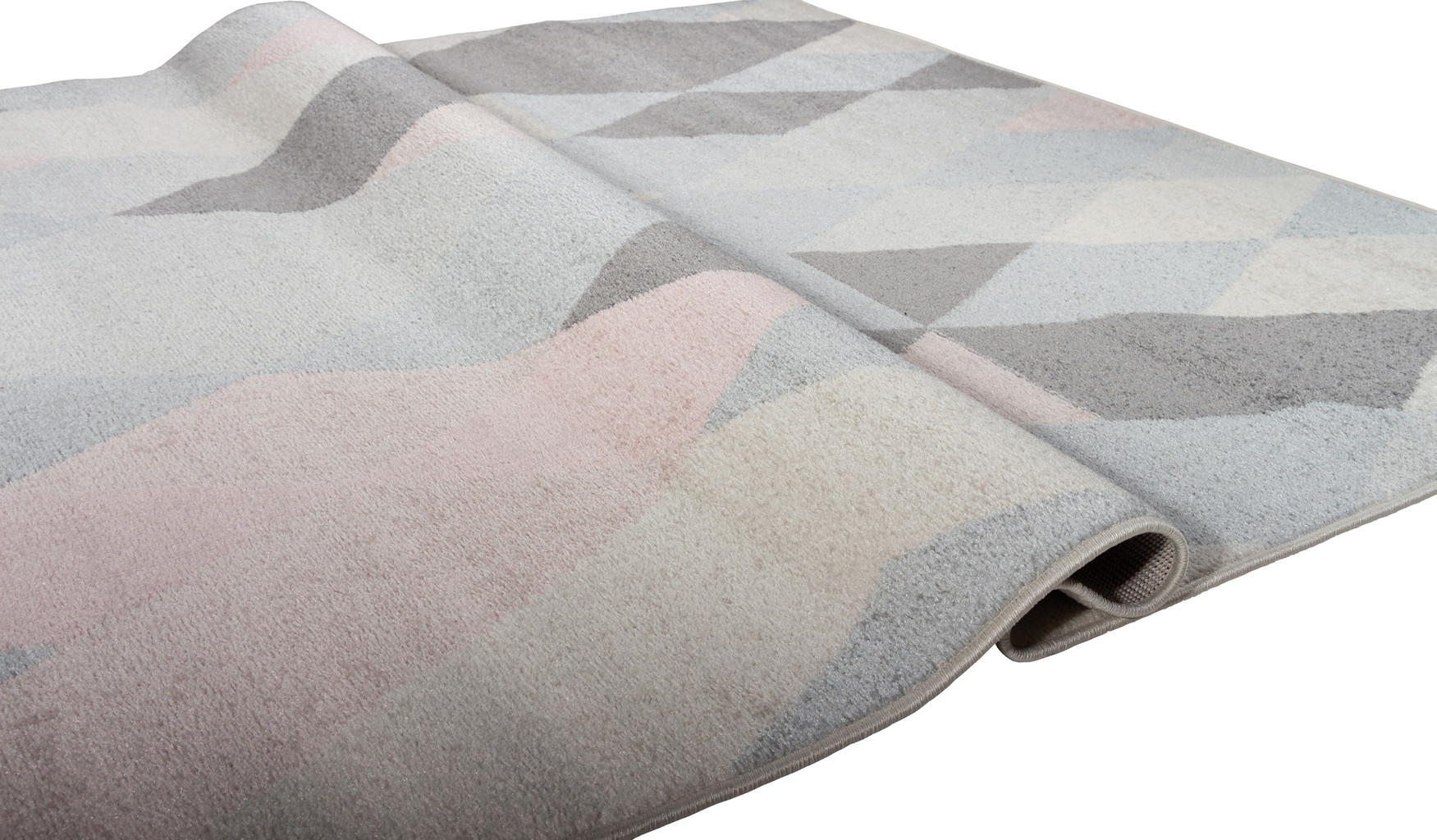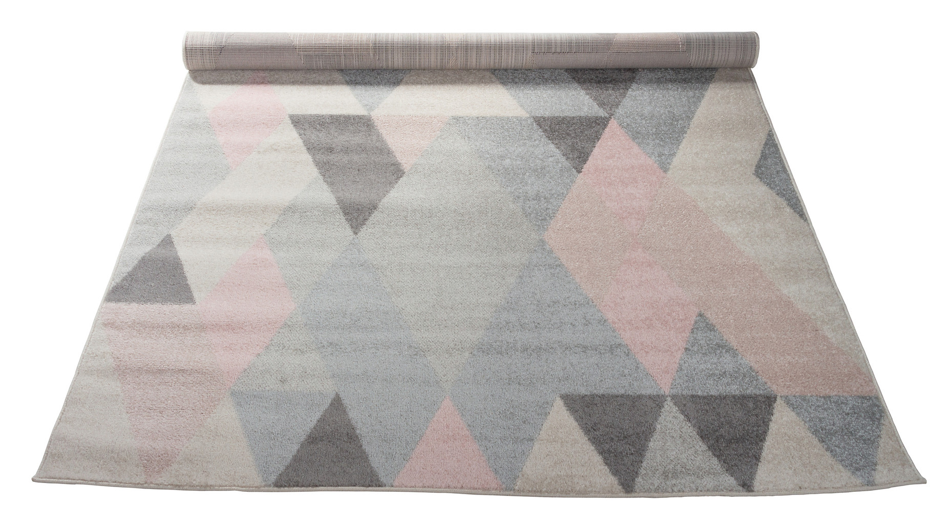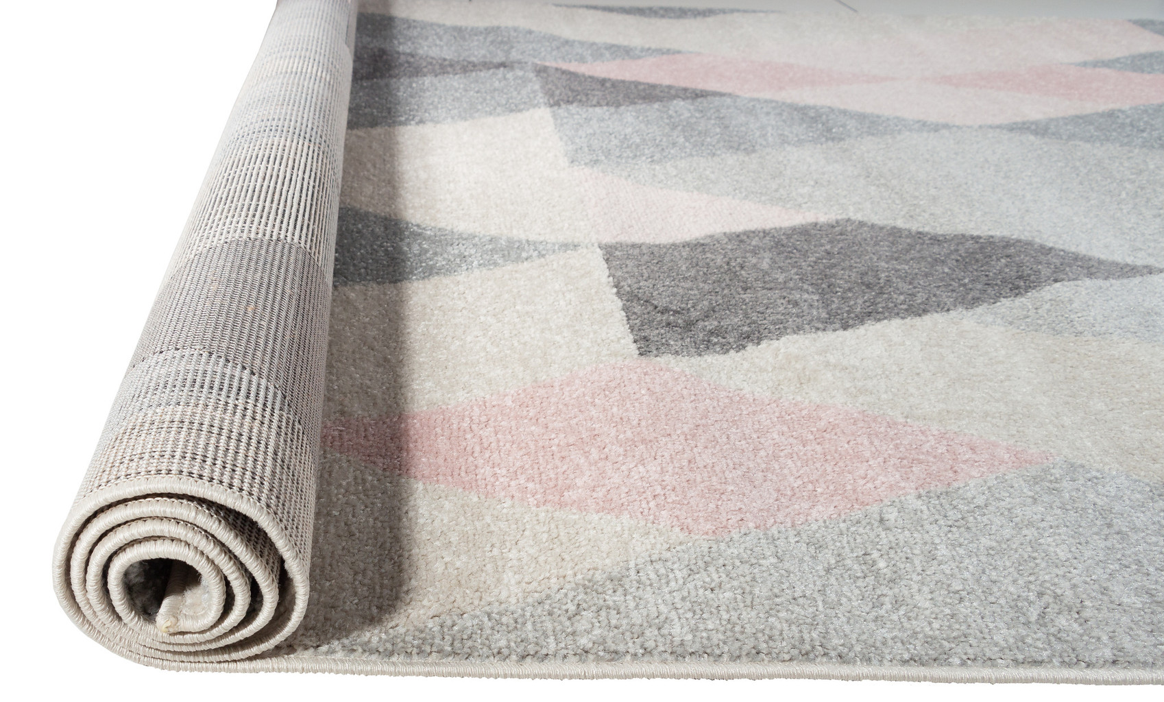 Moderný koberec Pearl Stream 09 so zaujímavým vzorom z ružových a sivých kosoštvorcov a trojuholníkov