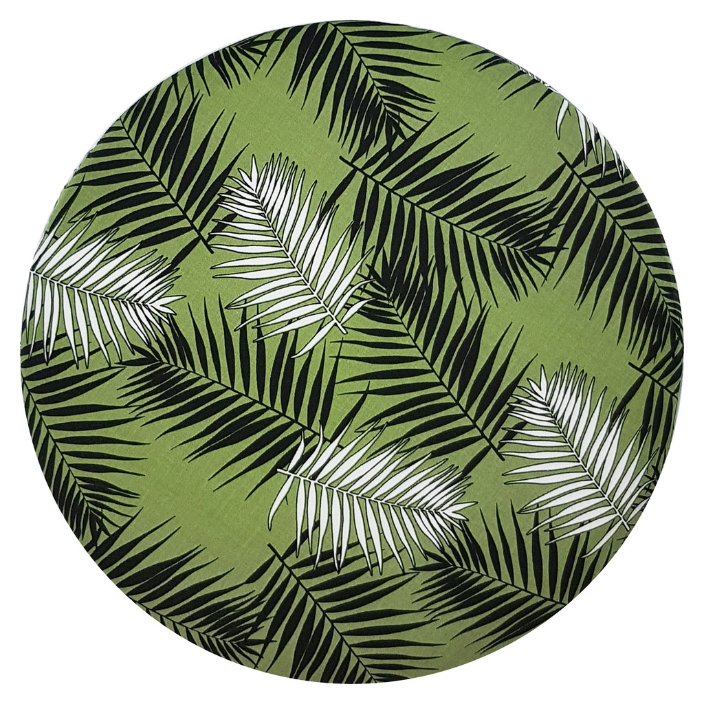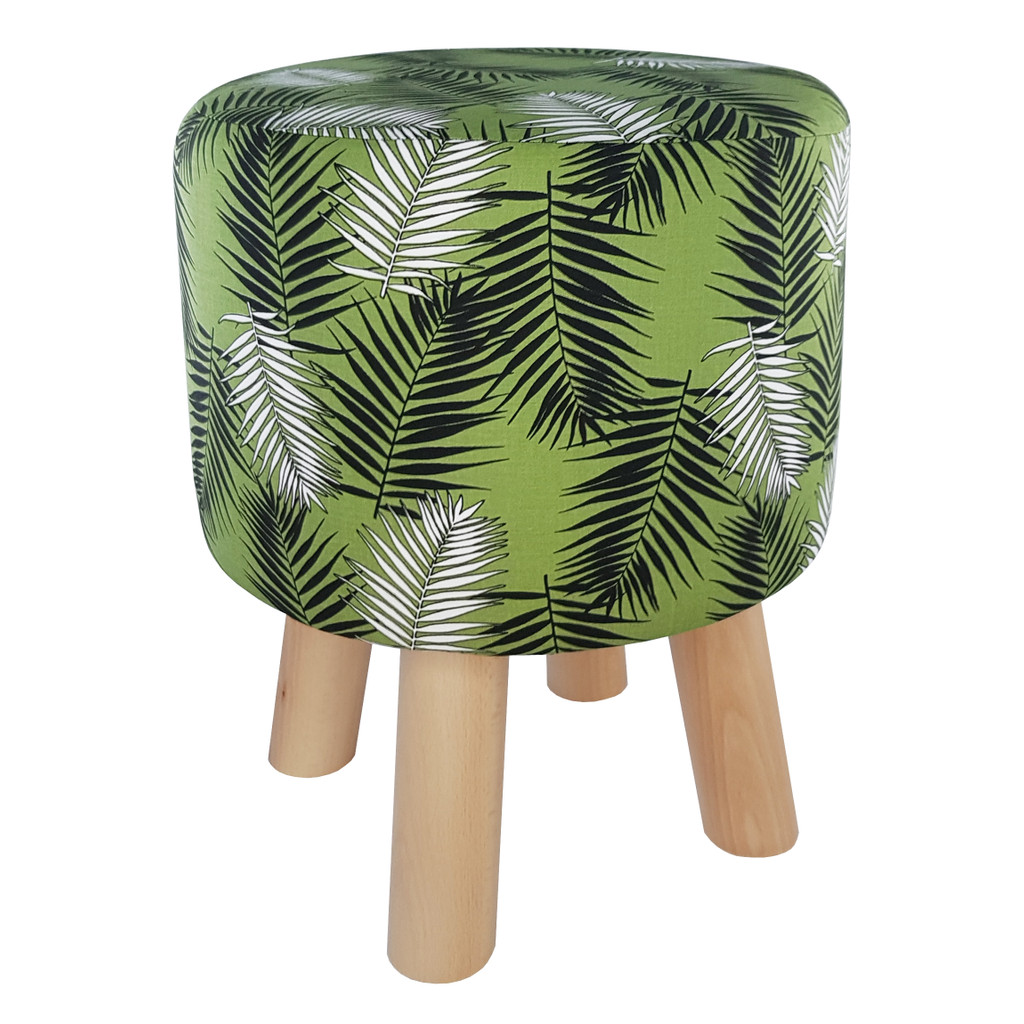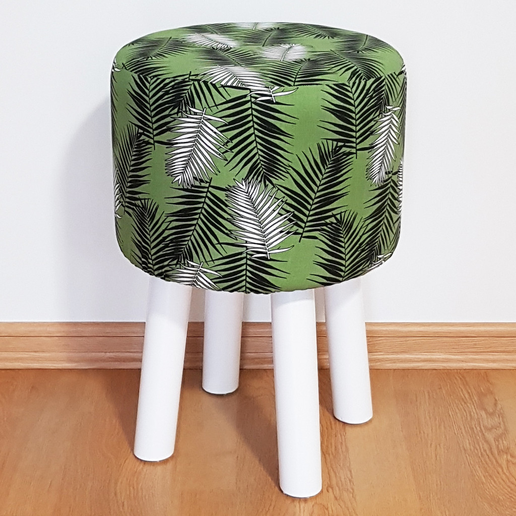 Dizajnová taburetka so vzorom Jungle, ktorý predstavujú krásne palmové ratolesti, čerň a beloba listov na pozadí módnej olivovej zelene. Tento puf má veľmi mäkké, pohodlné sedadlo namontované na stabilných drevených nohách v dvoch farebných variantoch: prírodné drevo alebo biela farba.