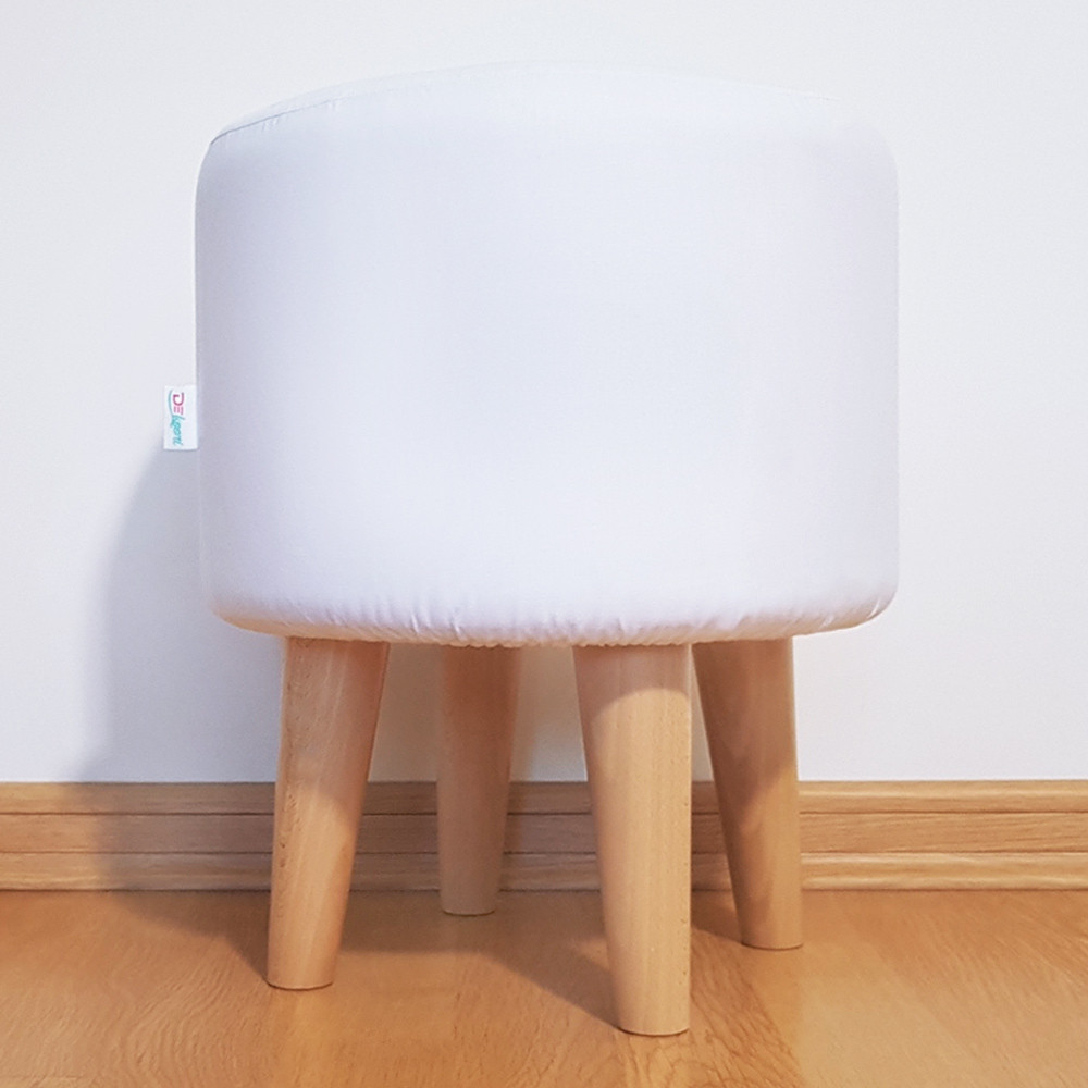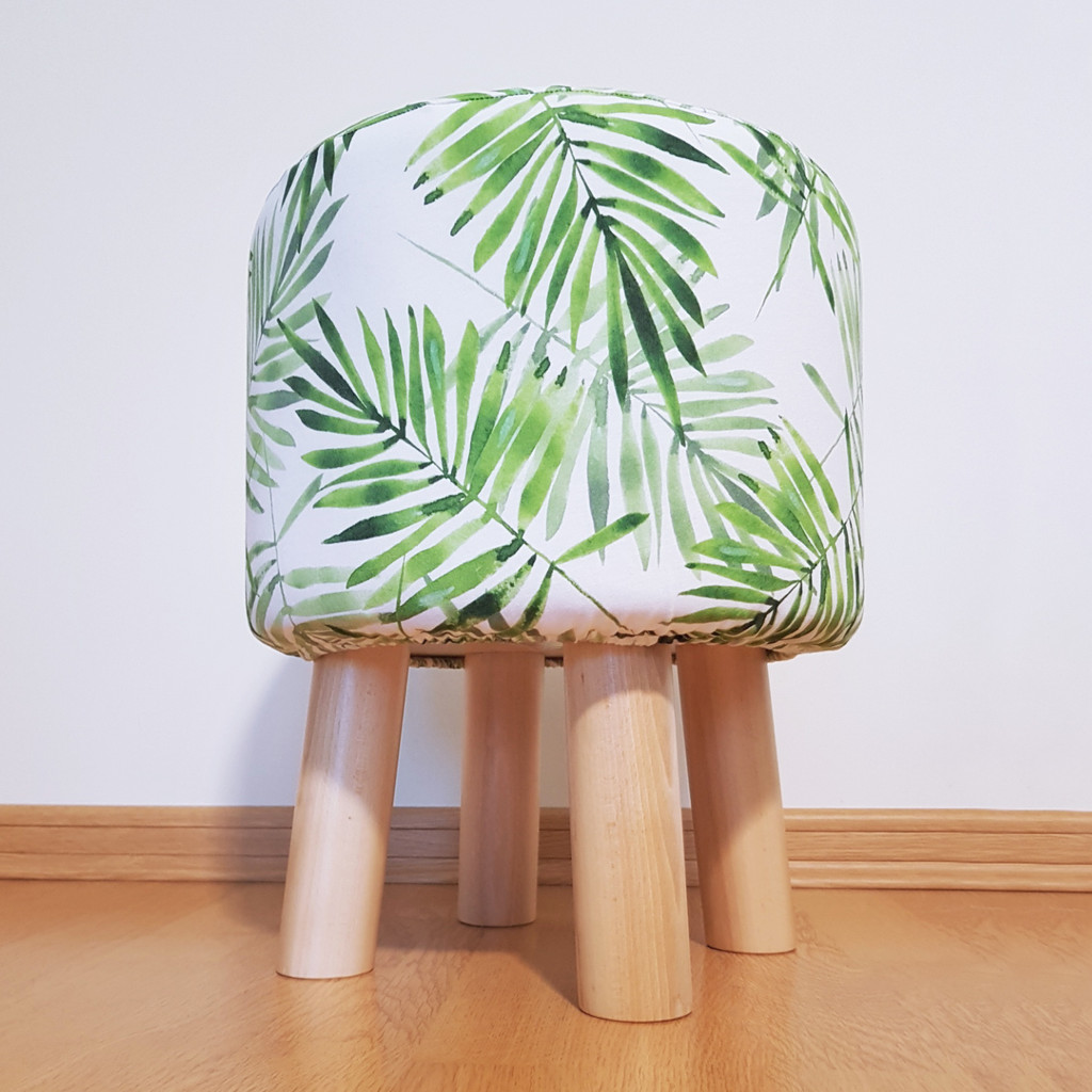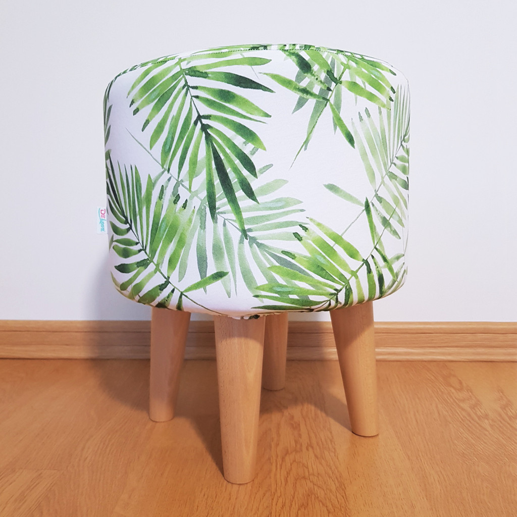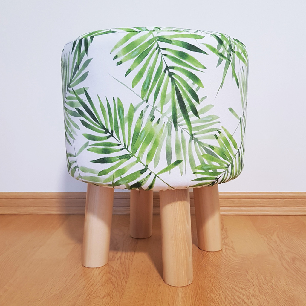 Biely stolček, moderná taburetka, puf do obývacej izby, do spálne alebo do iných miestností s odnímateľným poťahom vo veľmi módnom vzore: dekoratívne zelené listy rastliny Nephrolepis (papraď Nefrolepka).