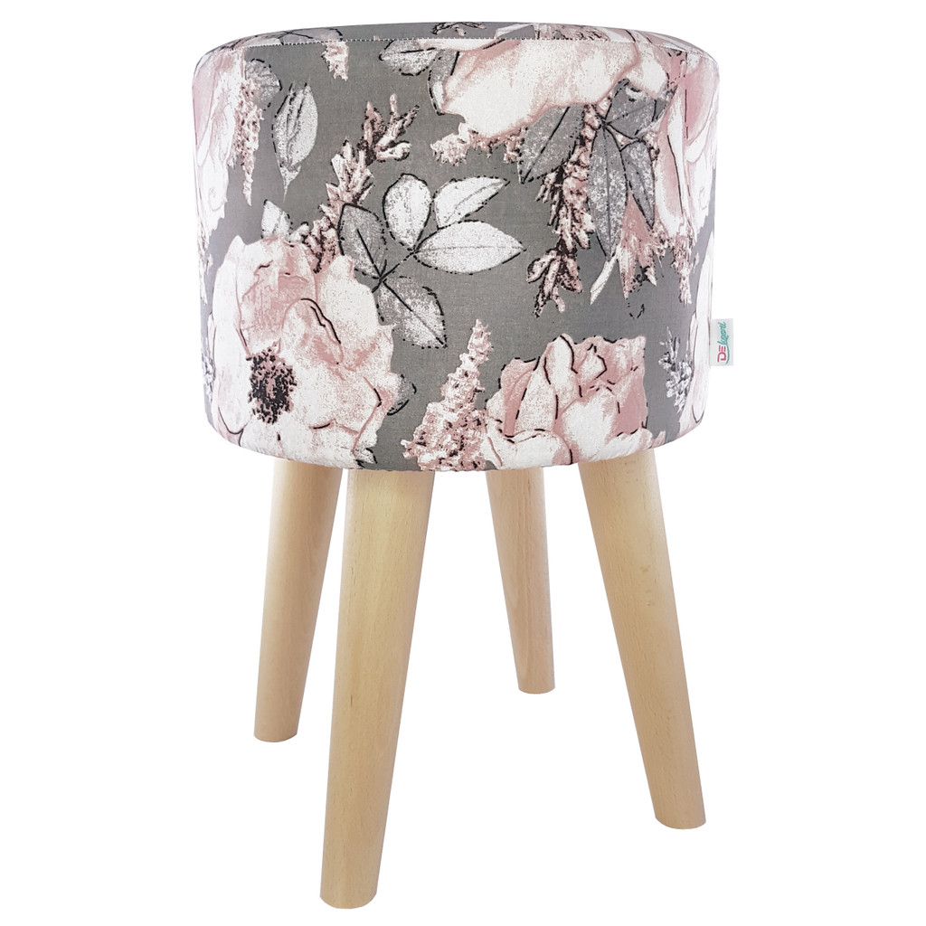 Módny sivý puf s jemnými kvetmi divokej ruže. Svojím mäkkým sedadlom upevneným na stabilných nohách zo silného dreva vás poteší v každej miestnosti.