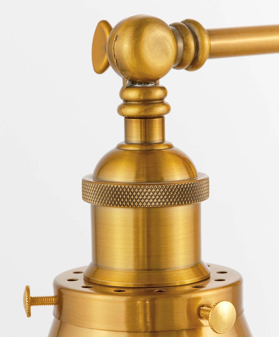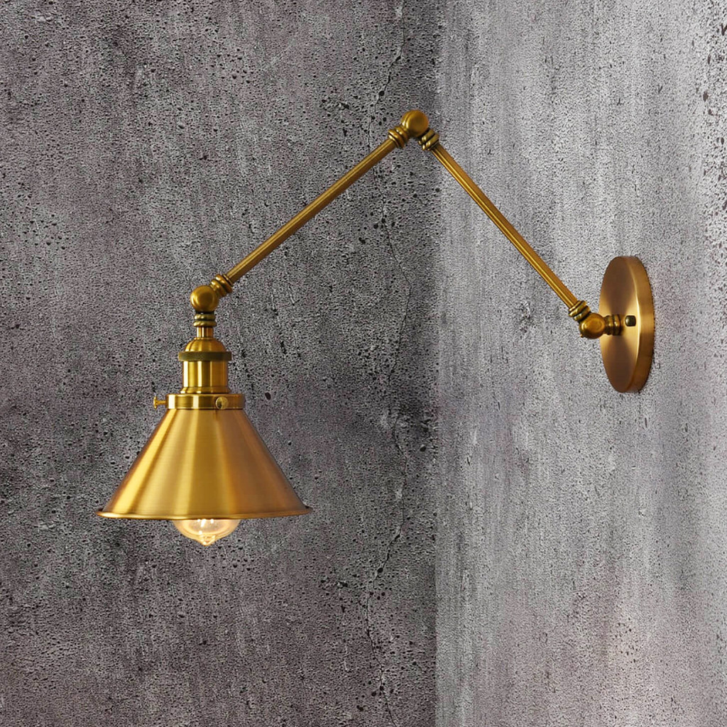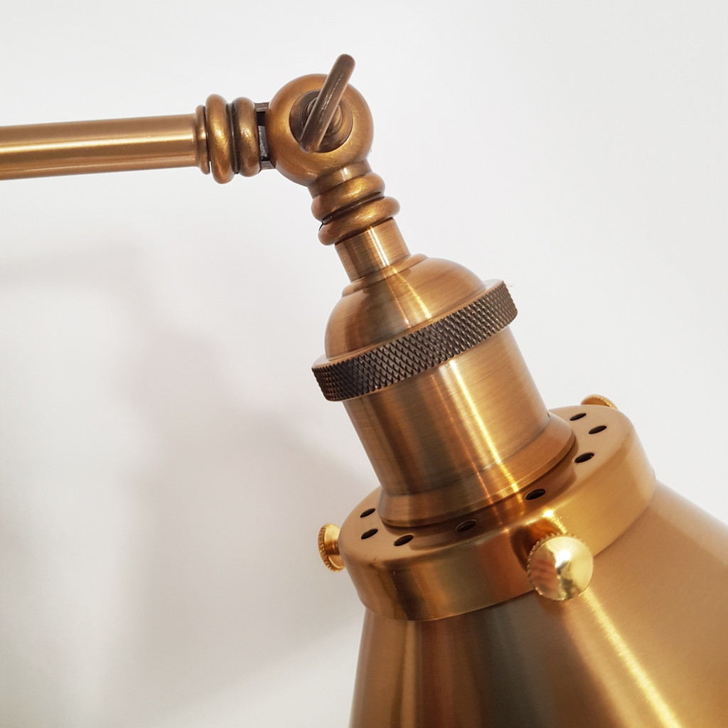 Pôsobivé priemyselné nástenné svietidlo GUBI W2 s povrchovou úpravou vo farbe zlatej mosadze. Vyrobené z lešteného kovu. Ideálne pre moderné interiéry v štýle loft, ale aj pre miestnosti, kde dominuje retro vintage. Polohovateľné rameno umožňuje voľne nastaviť túto nástennú lampu na čítanie v spálni alebo v obývacej izbe.
