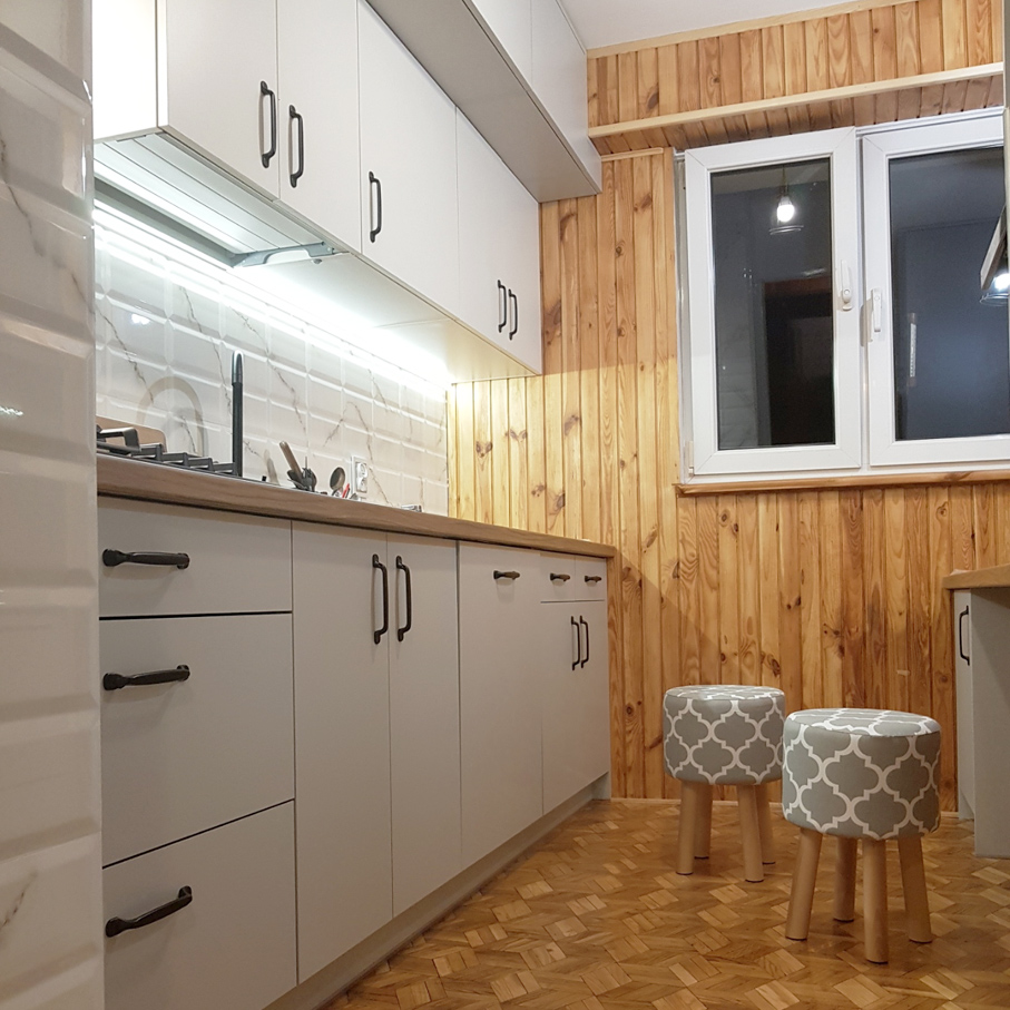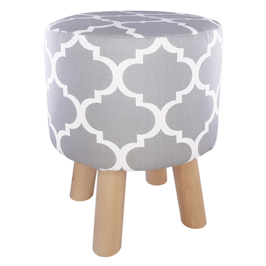 Drevená taburetka, okrúhly sivý puf s pohodlným sedadlom a odnímateľným poťahom z bavlnenej tkaniny s bielym vzorom, marocká ďatelina. Hodí sa pre škandinávsky štýl a loftové interiéry. Na výber je nízky alebo vysoký taburet podľa priania.