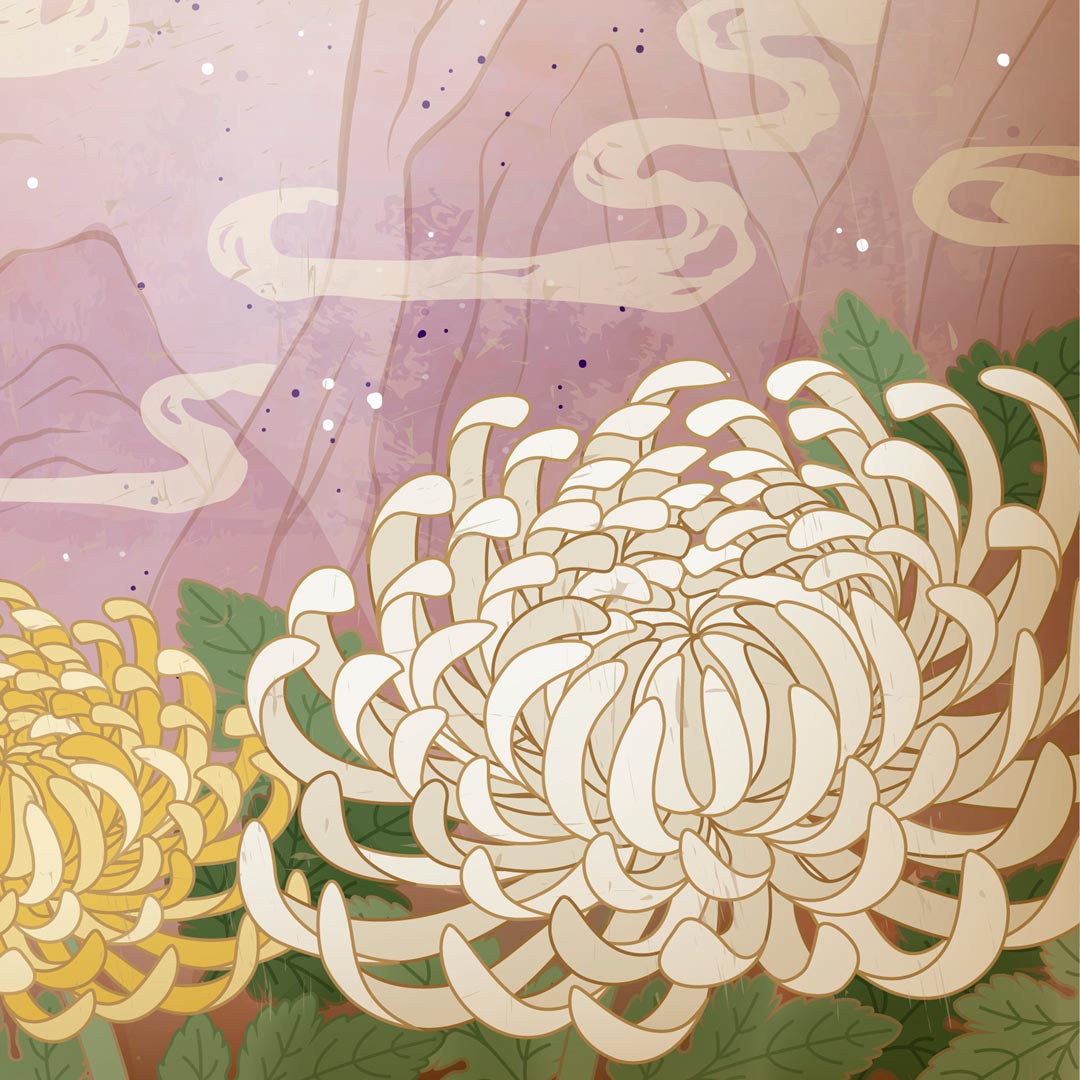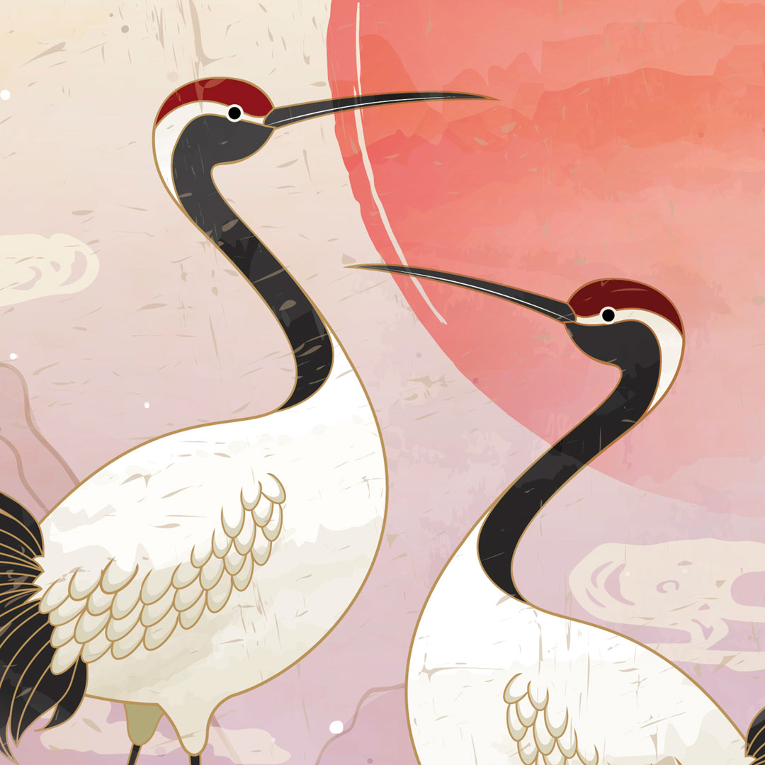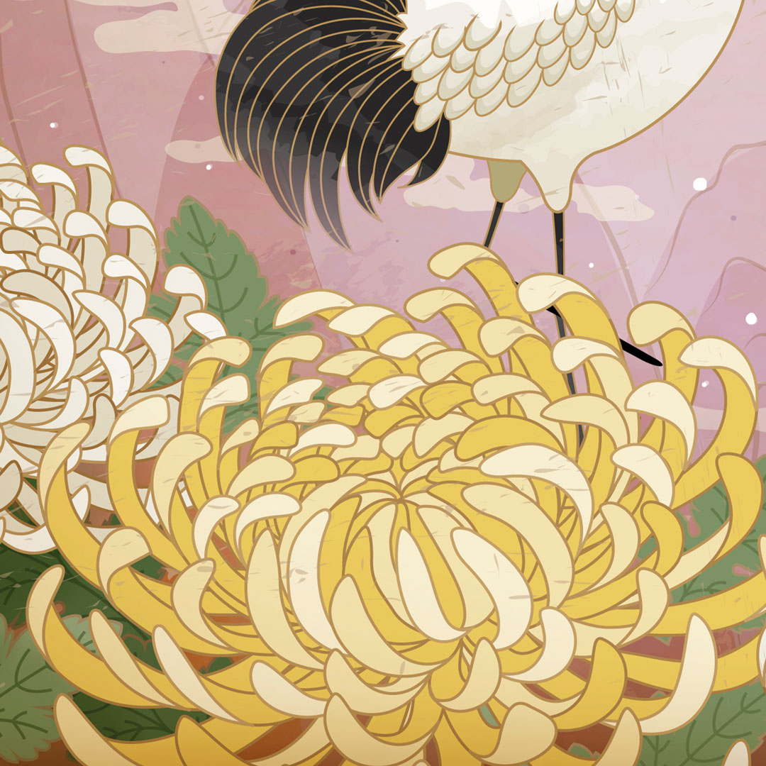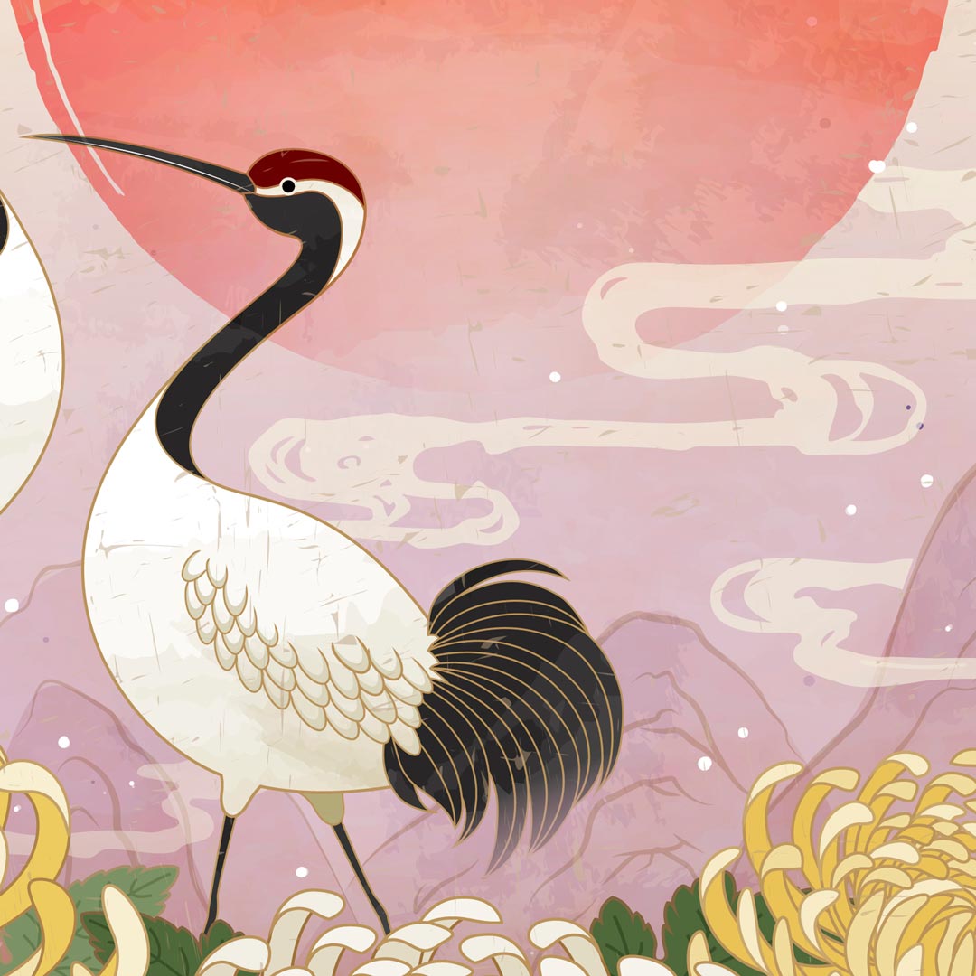 Orientálna tapeta v japonskom štýle so starnúcim efektom. Grafika zobrazuje volavky na kvetoch chryzantém na pozadí červeného zapadajúceho slnka a hôr na obzore.