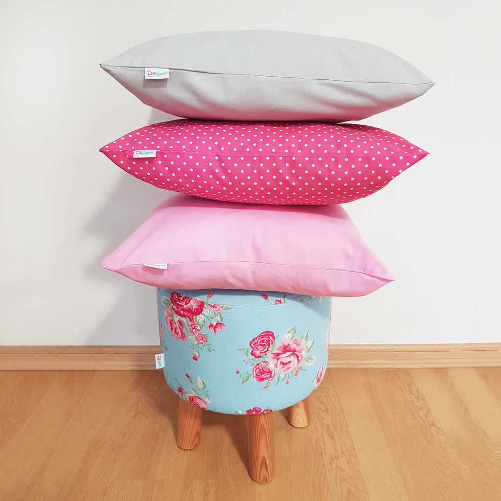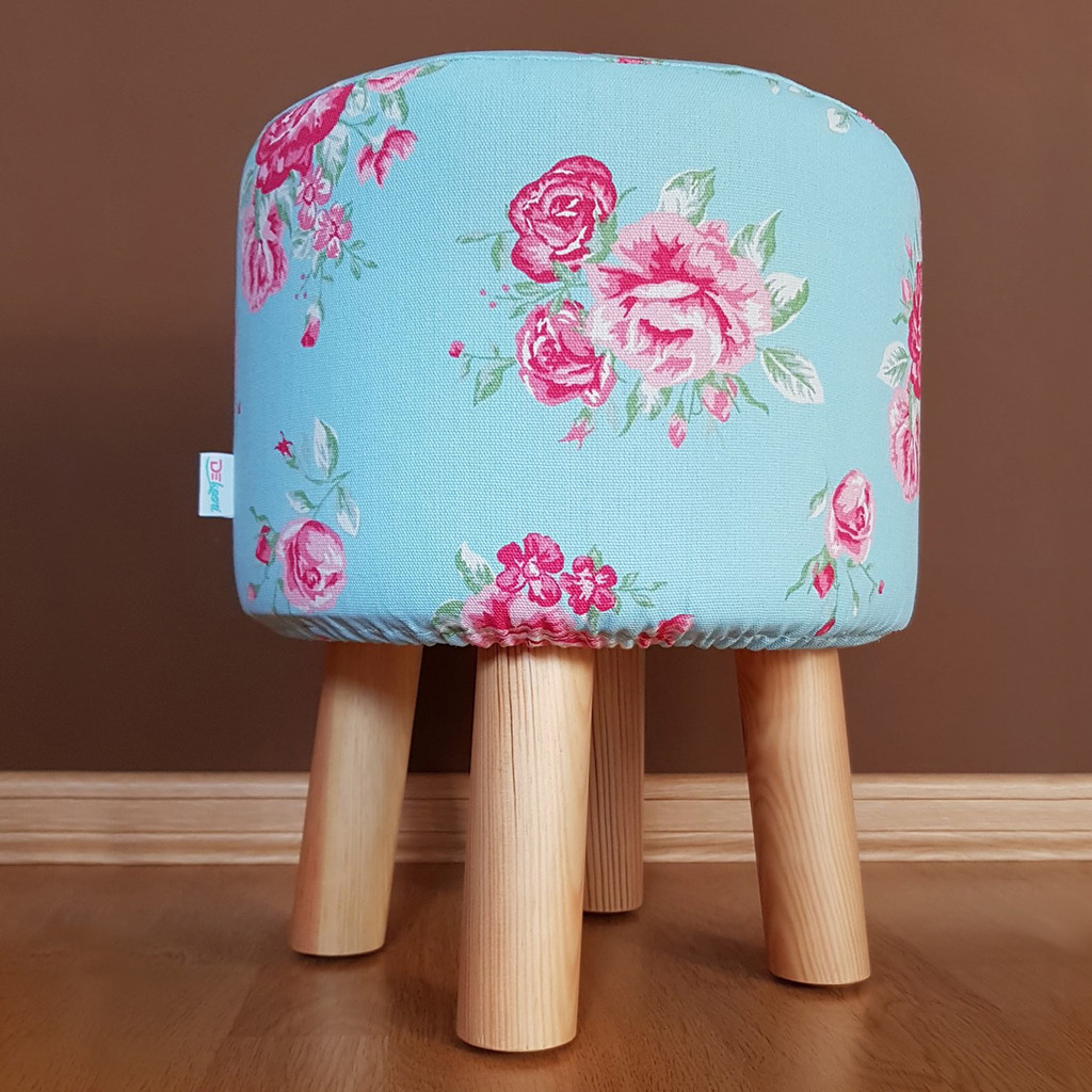 Krásna dekoratívna taburetka, ozdobný puf v štýle glamour s pohodlným sedadlom a odnímateľným poťahom vyrobeným z bavlnenej tkaniny s motívom ružovej ruže na svetlomodrom pozadí. Na výber je nízky alebo vysoký taburet, podľa priania.