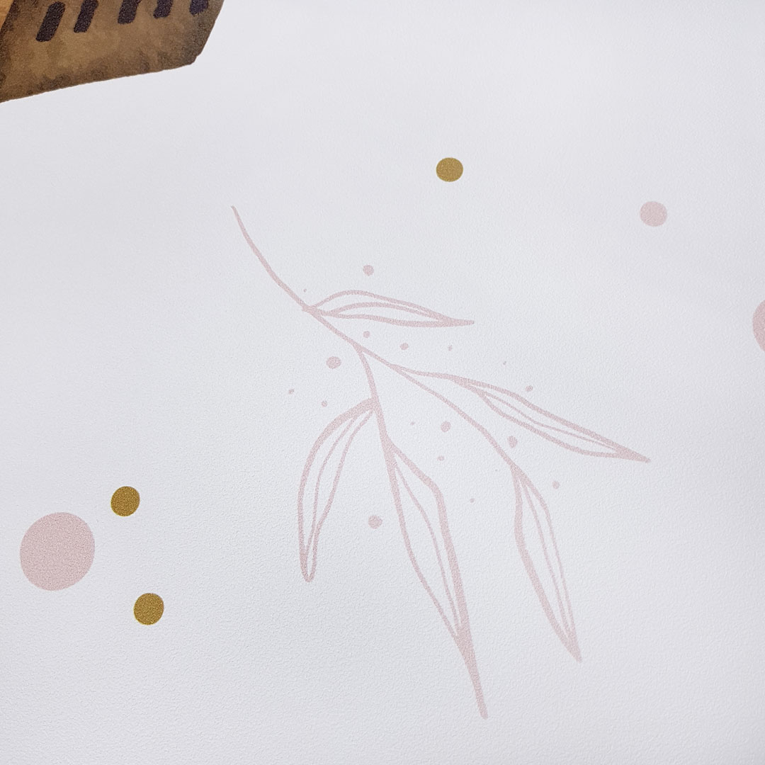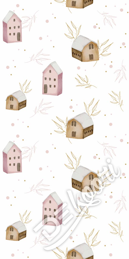 Jemná dievčenská tapeta na stenu s rozprávkovými perníkovými chatrčami, s ružovými a hnedými bodkami a jemnými vetvičkami. Vďaka možnosti zmeny farby a vzoru našich tapiet môže byť každá chata taká, akú chcete!