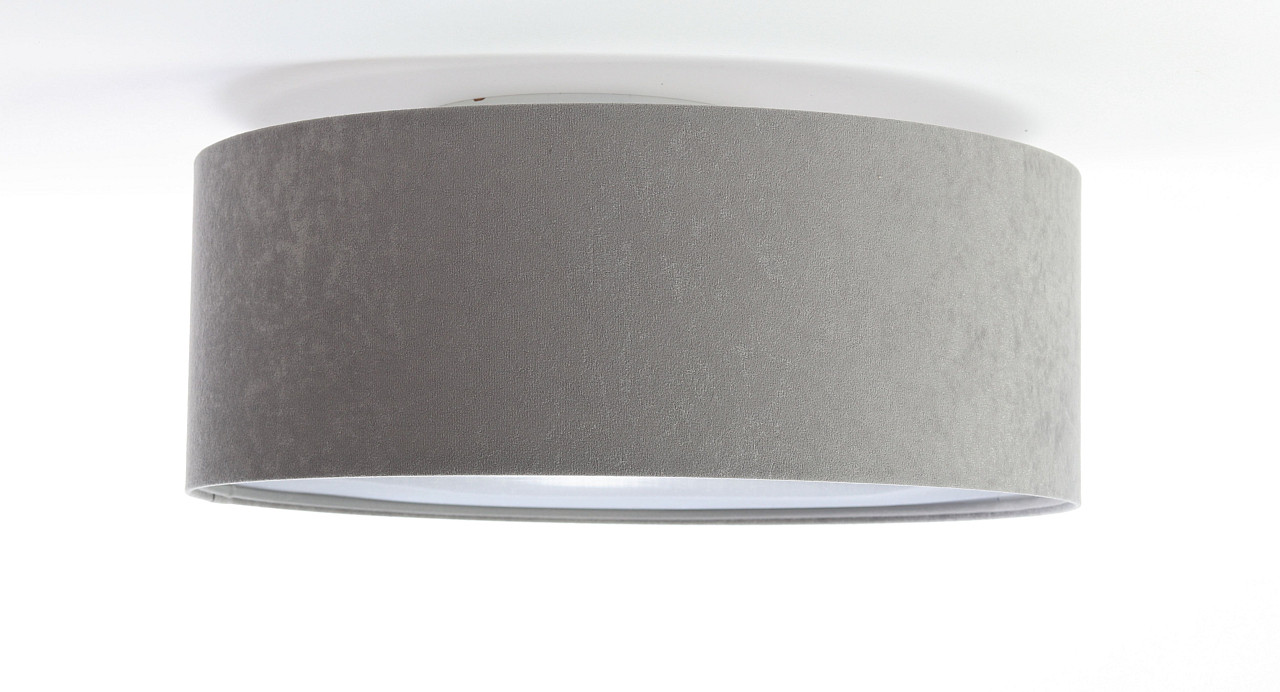 Sivá stropná lampa, stropnica z velúru s valcovým okrúhlym tienidlom