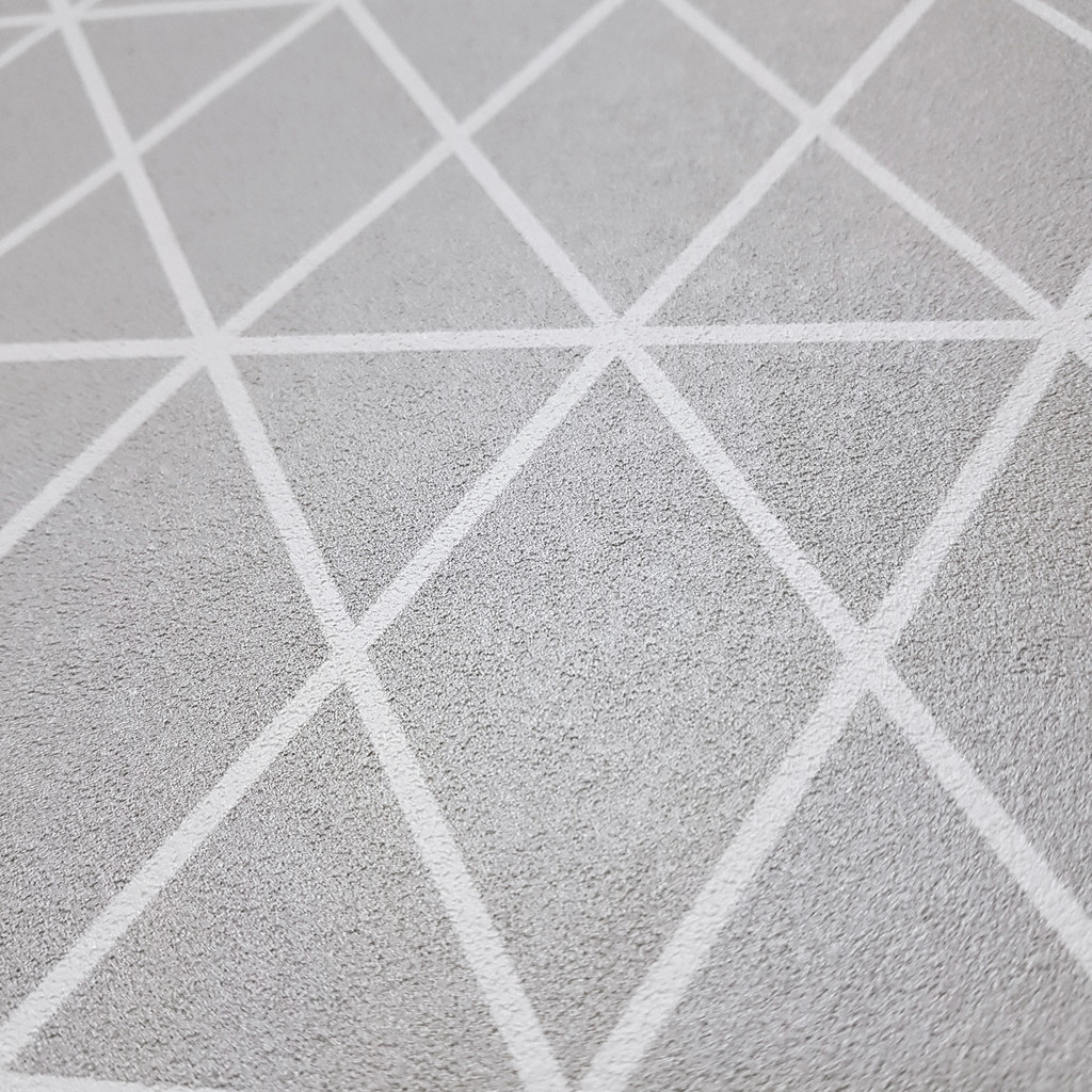 Sivo-biela geometrická tapeta na stenu, LÍNIE, TROJUHOLNÍKY, KOSOŠTVORCE