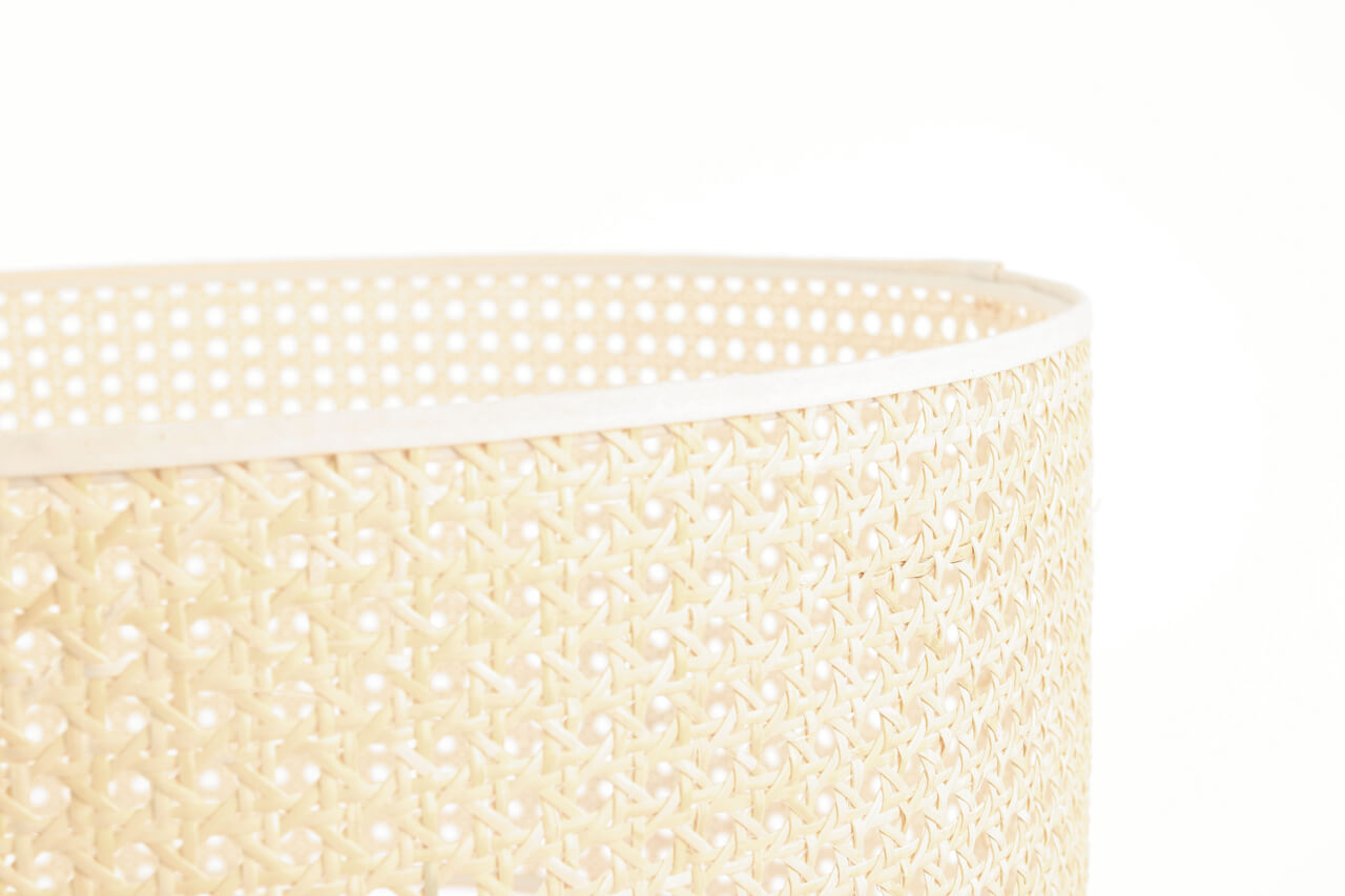 Stojacia lampa ROTANG v boho štýle s prírodným ratanovým tienidlom v tvare valca na trojnožke