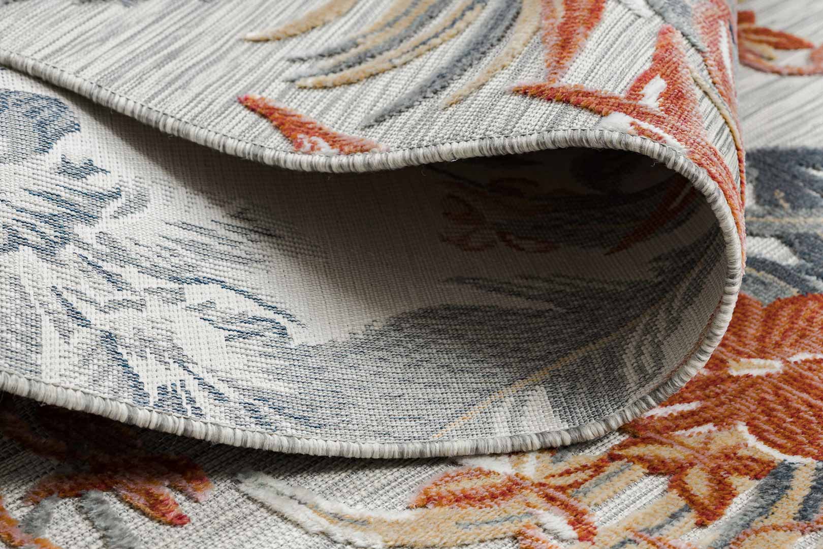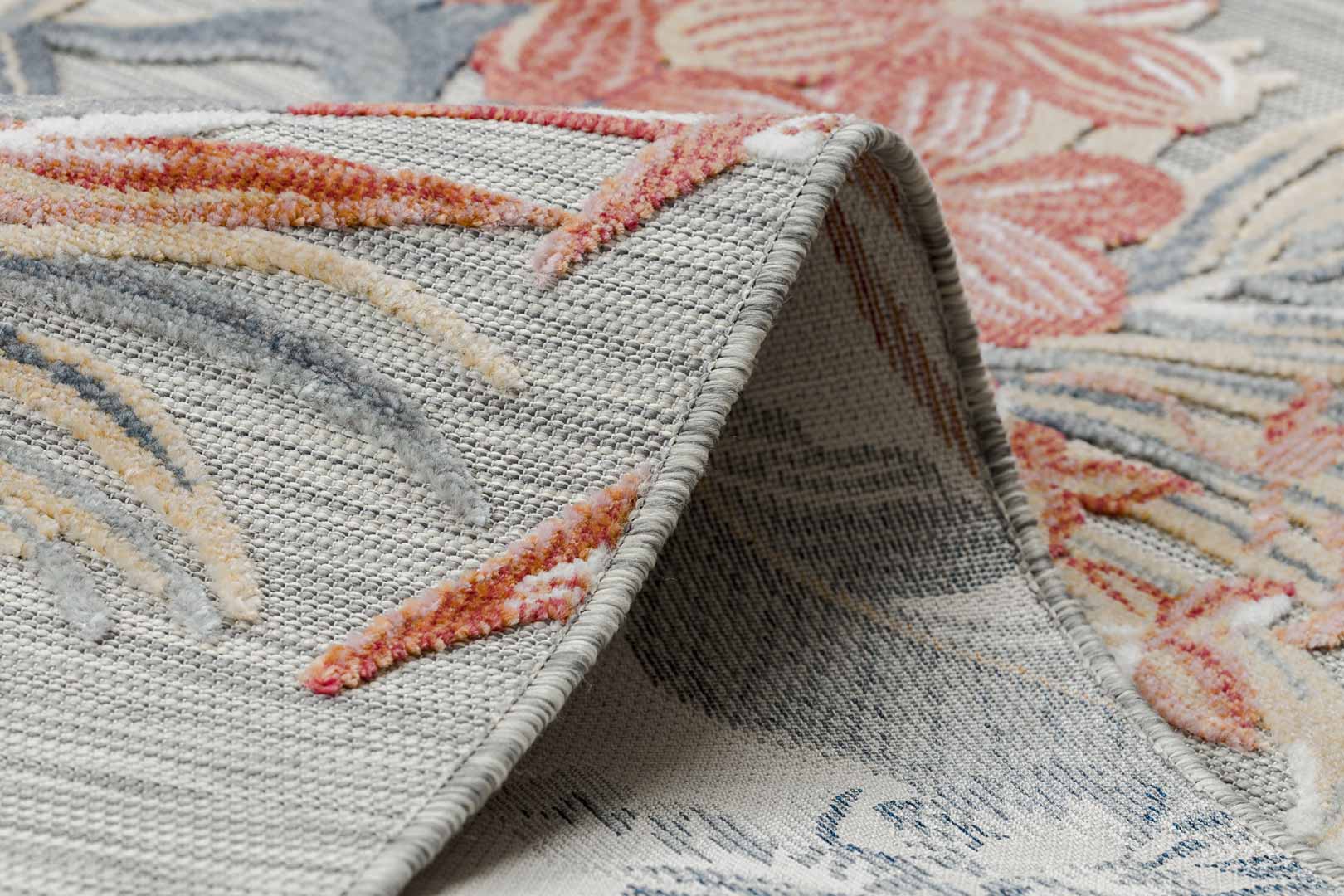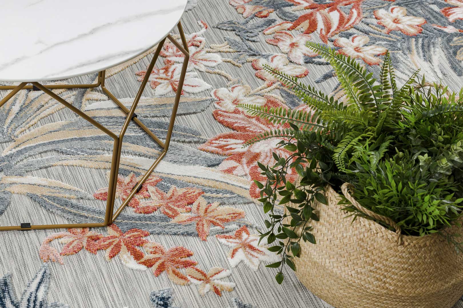 Tento koberec je umenie samo o sebe! Táto originálna kombinácia originálneho kvetinového vzoru a jemných farieb: sivej, tehlovej (červenej) a žltej, prinesie príjemnú atmosféru do minimalistickej spálne aj do rustikálnej obývačky. Pri výrobe sa používajú dve úrovne vlasu: plocho tkané vlákna a tradičný strihaný vlas. Bez námahy sa vysávajú, čo je veľmi nápomocné pri udržiavaní estetického vzhľadu a dlhodobej čistoty koberca. Koberec sa môže používať aj v exteriéri, pretože je odolný voči poveternostným podmienkam.