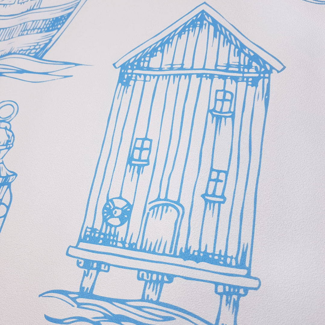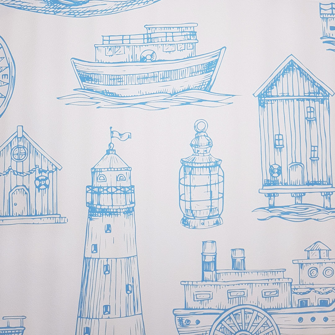 Svetlá tapeta s morským, námorníckym motívom, majáky a lode, biela a modrá