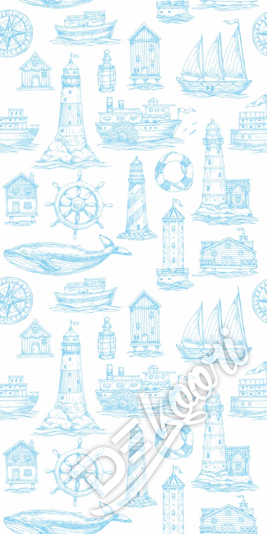 Biela tapeta v námornom štýle s bledomodrými majákmi, loďami, kormidlami, kompasmi, záchrannými kolesami a veľrybami. Toto je druhá farebná verzia tohto jedinečného vzoru. Ideálna rovnako tak do izbičky malého prieskumníka, cestovateľa, ako aj do obývacej izby alebo reštaurácie.