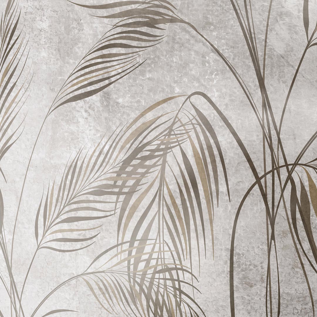 Dekoratívna tapeta, béžové a hnedé palmové listy na krémovo-sivom pozadí, boho štýl