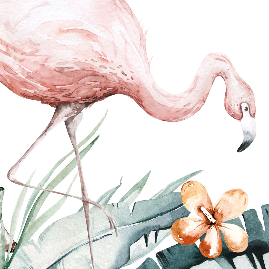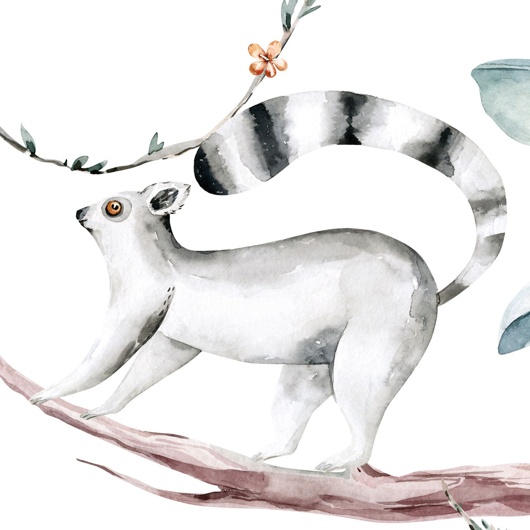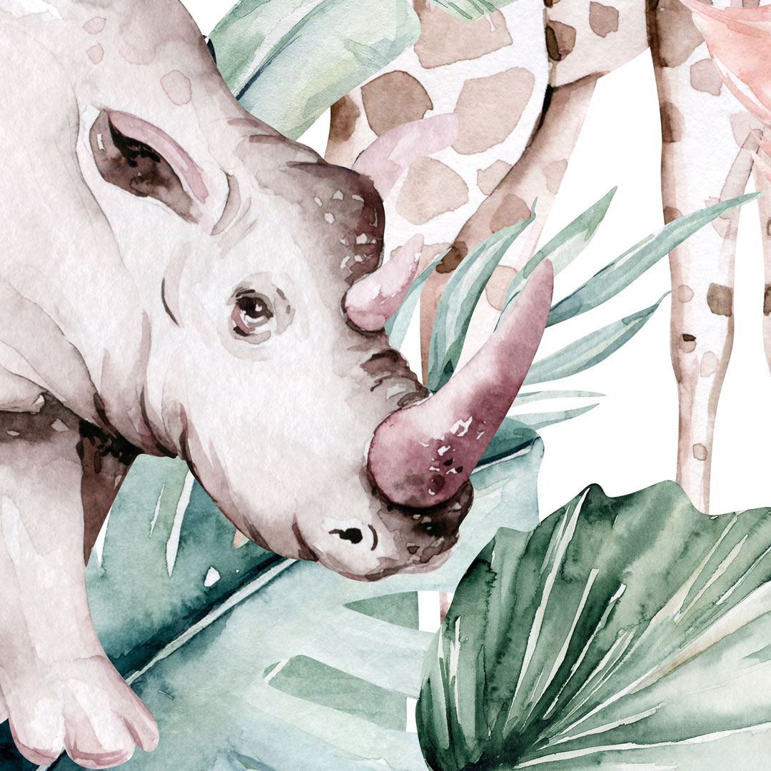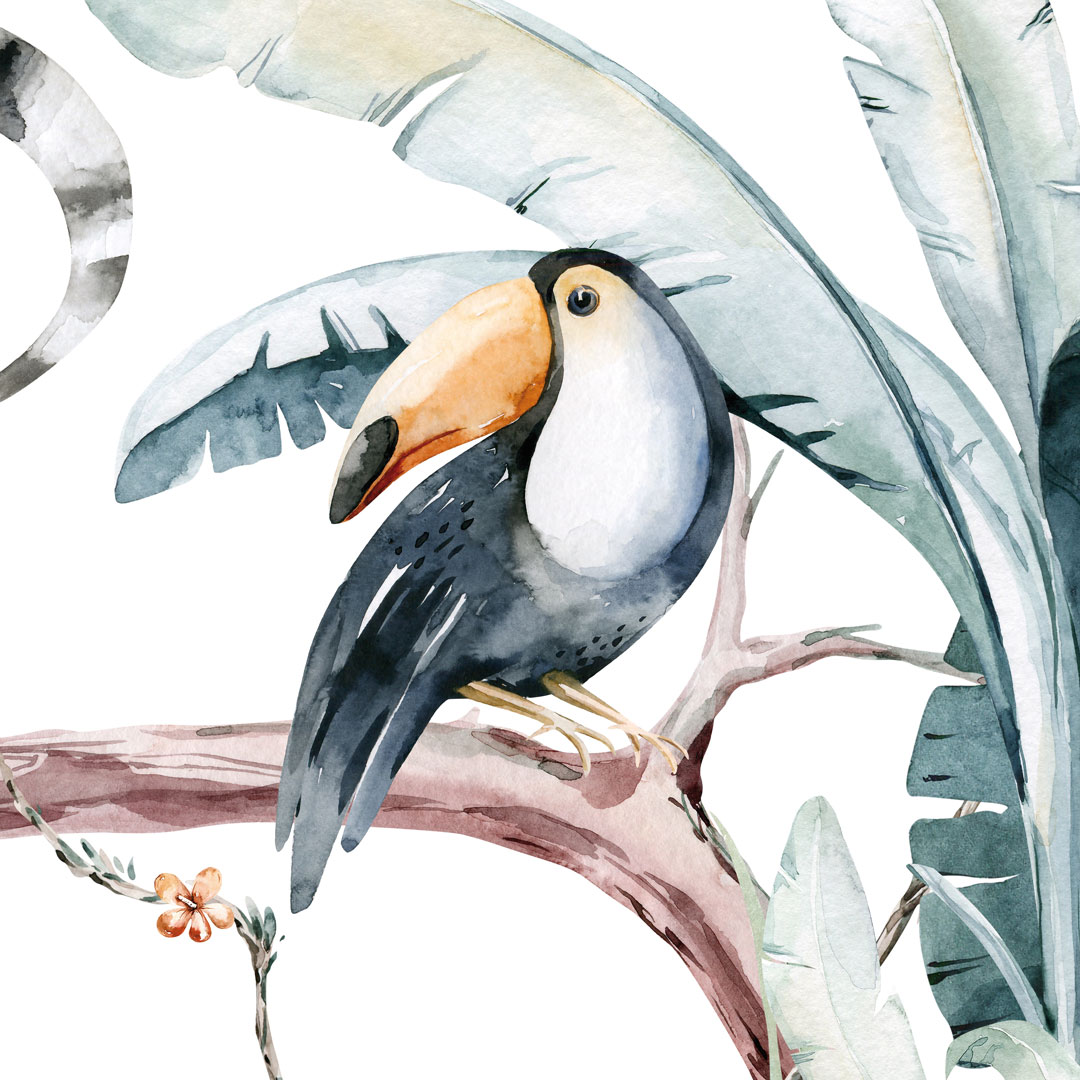 Táto krásna a farebná tapeta v štýle akvarelu vezme vaše dieťa na objavnú cestu exotickou džungľou. Vďaka detskému safari si môže medzi lianami a banánovými listami zblízka pozrieť divoké, ale priateľské zvieratá: žirafu, lemura, tukana, nosorožca, plameniaka a slona.