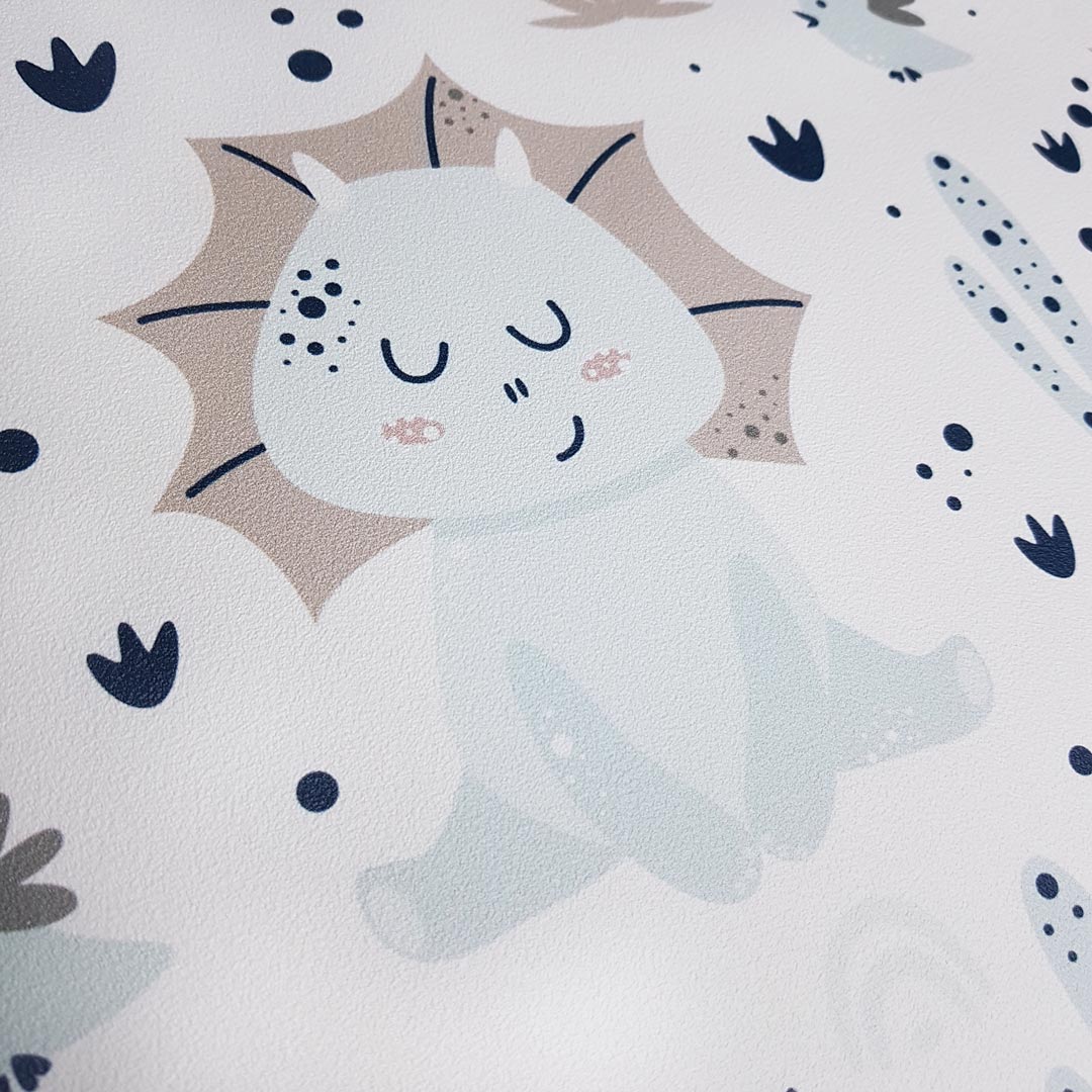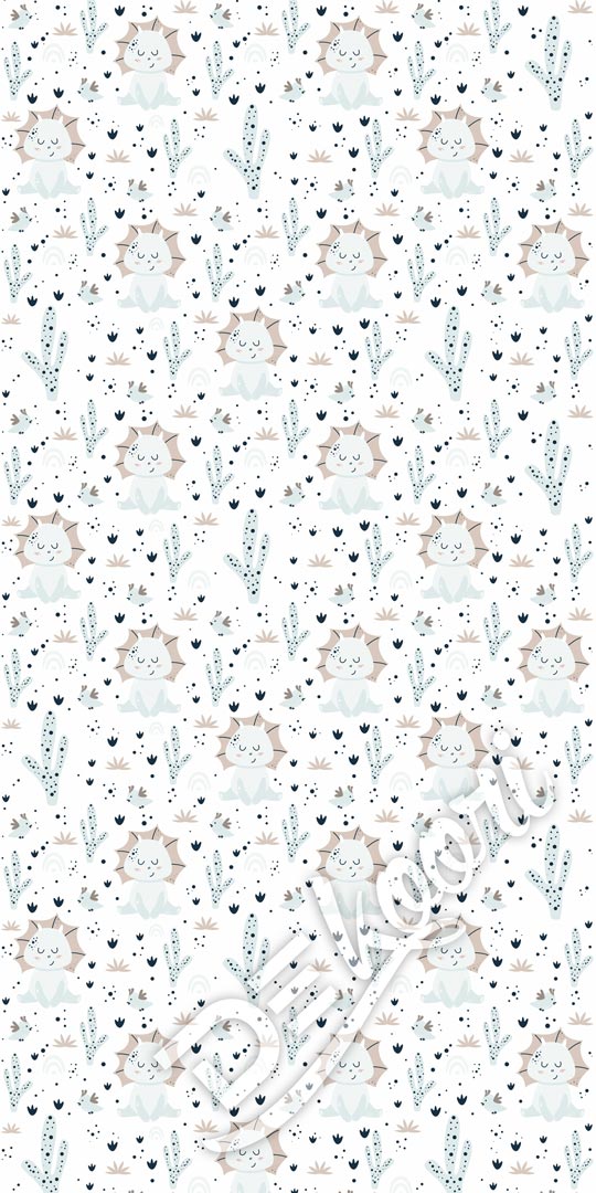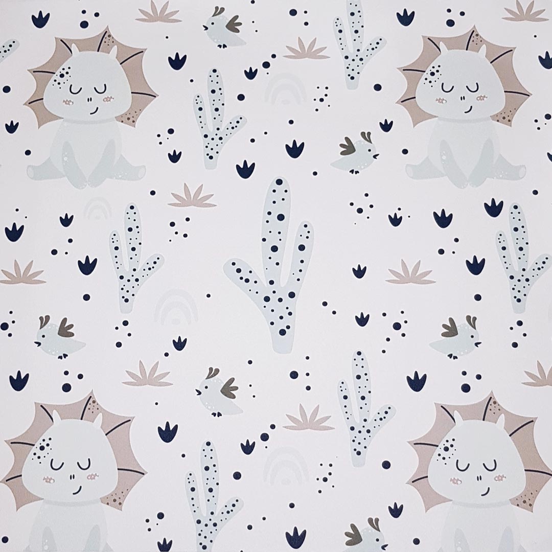 Detská priateľská nástenná tapeta s dinosaurom Bobom, ktorý vedie šťastný život v horúcej púšti. Bobo rád všetkým ukáže svoj bytík medzi kaktusmi!