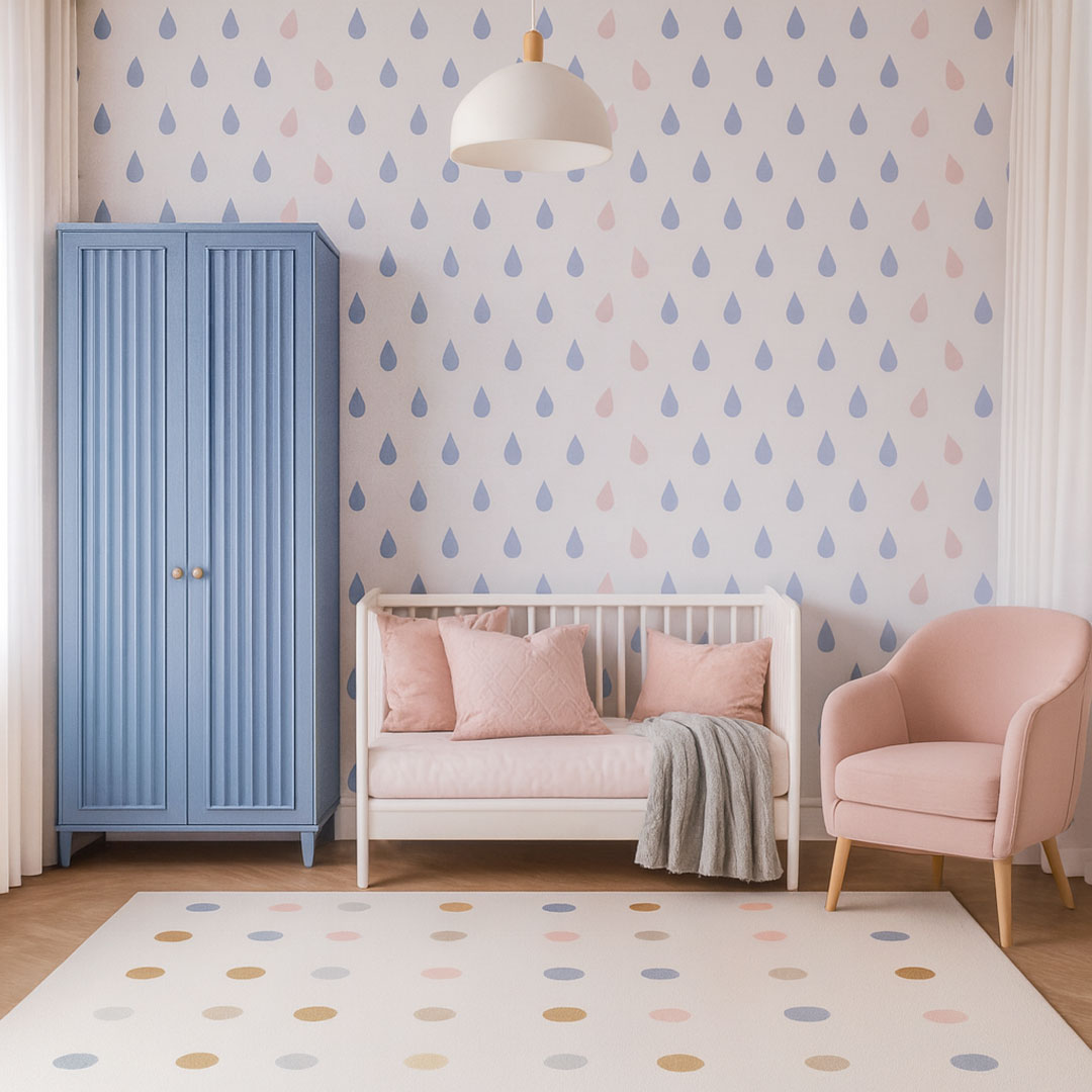 Roztomilá, moderná tapeta na stenu: farebné kvapky dažďa, vody, rosy, slzy na bielom pozadí. Vzor, dizajn s použitím moderných farieb roka Pantone 2016: Serenity a Rose Quartz - farby blízke modrej, fialovej a ružovej. Táto tapeta veľmi pristane najmä detskej izbe.