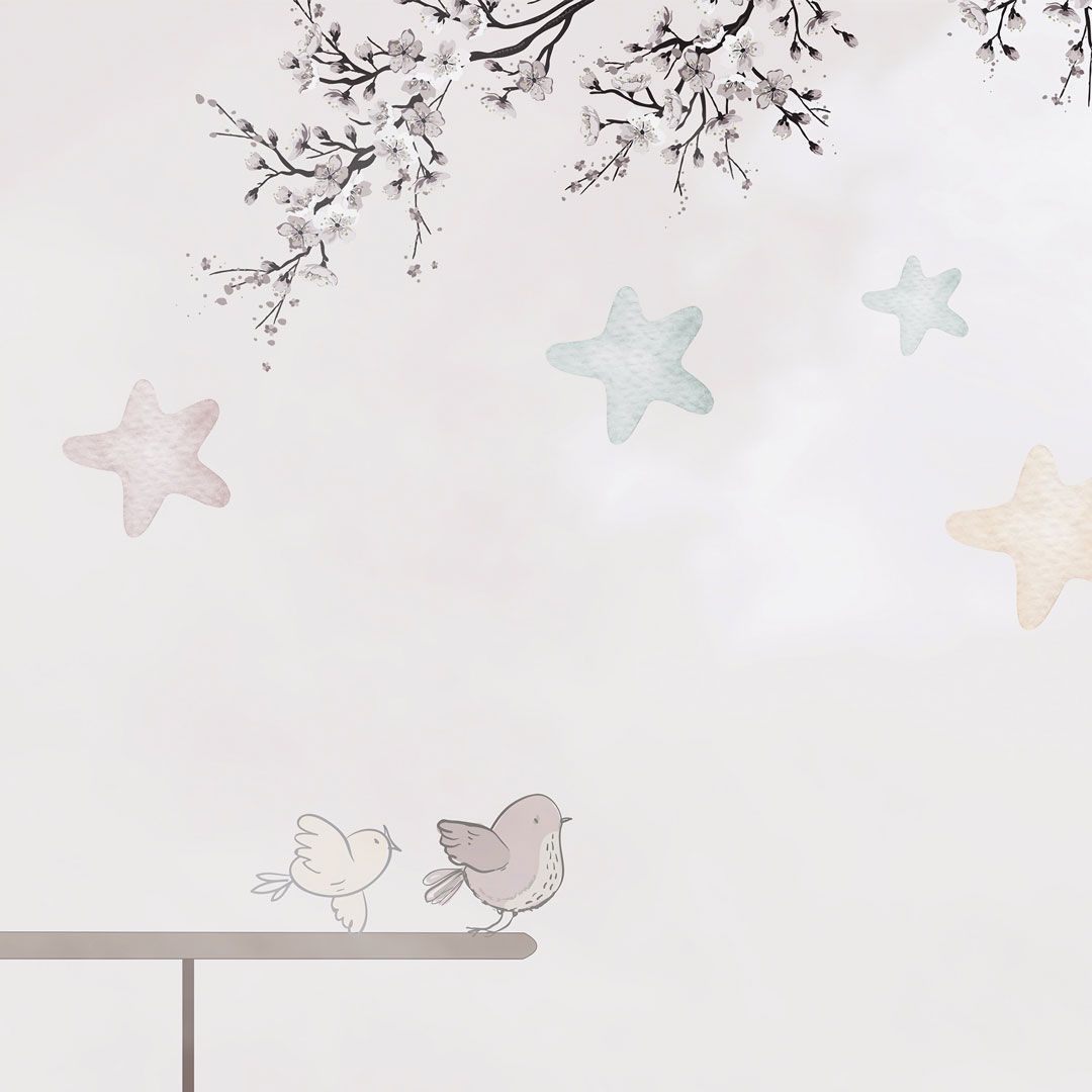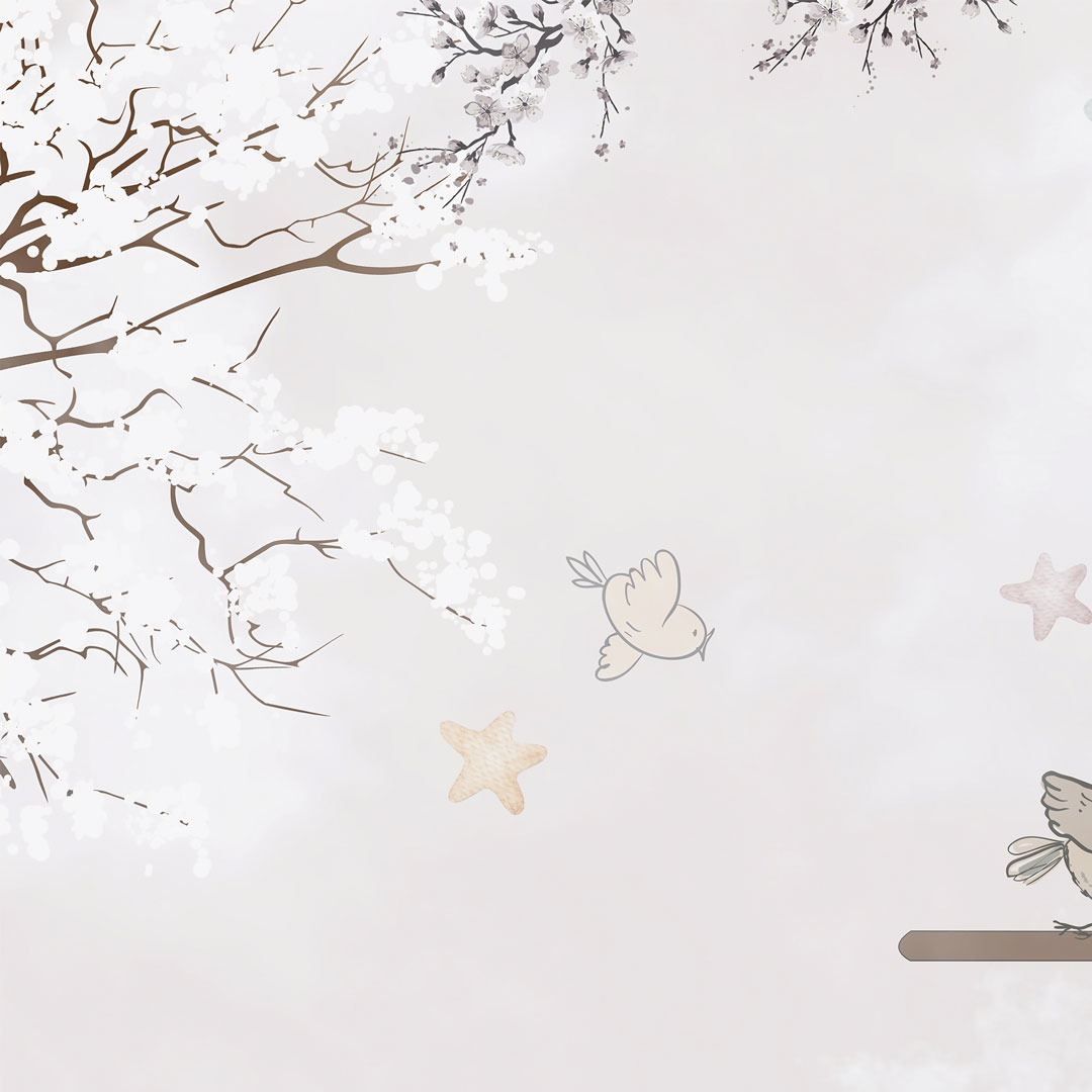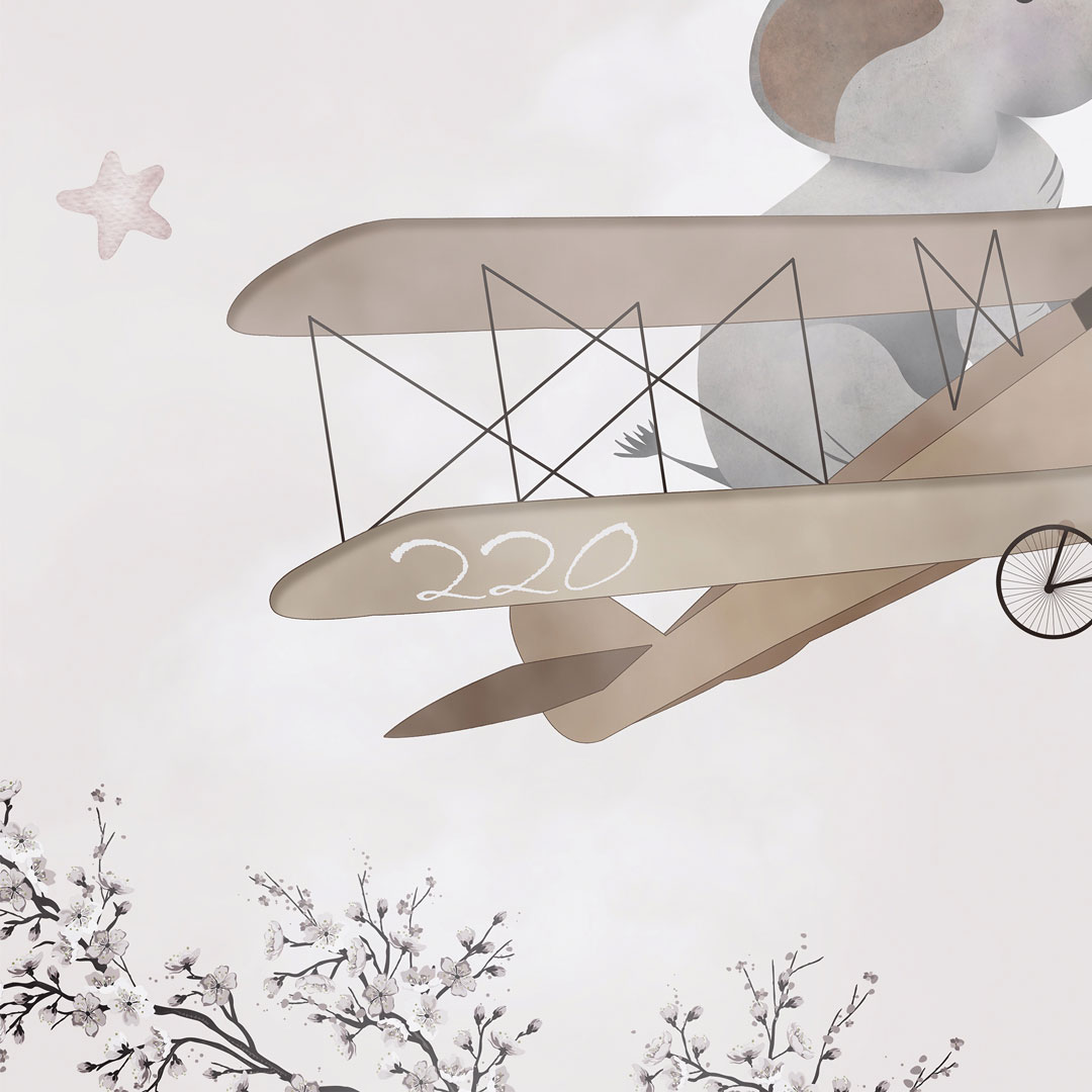 Béžová tapeta na stenu pre deti - cestovanie letúnom. Rozjarené zvieratká (žirafa, slon a panda) lietajú po oblohe medzi mrakmi a hviezdami v retro lietadlách s vrtuľami. Malé vtáčiky, očividne zvedavé na tento nezvyčajný pohľad, sedia na krídlach dvojplošníkov, aby si oddýchli a všetko si zblízka prezreli. Návrh je vyhotovený prevažne v pastelových akvarelových tónoch béžovej, hnedej a krémovej farby.