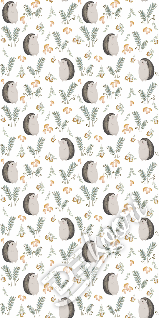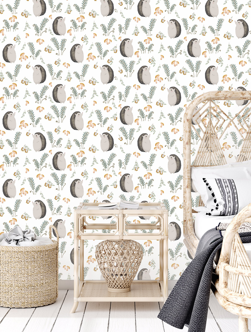 Očarujúca, biela tapeta na stenu s chodiacim pánom Ježkom ukazujúcim jesenné bohatstvo lesa!