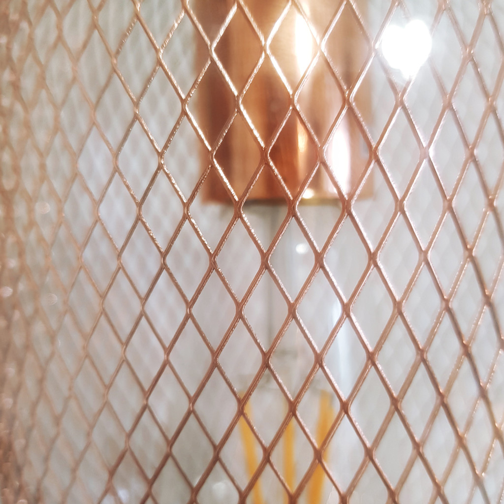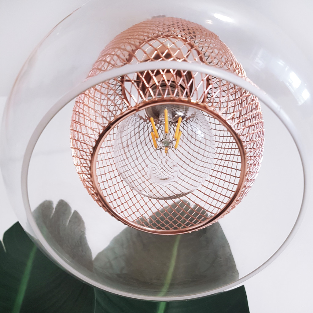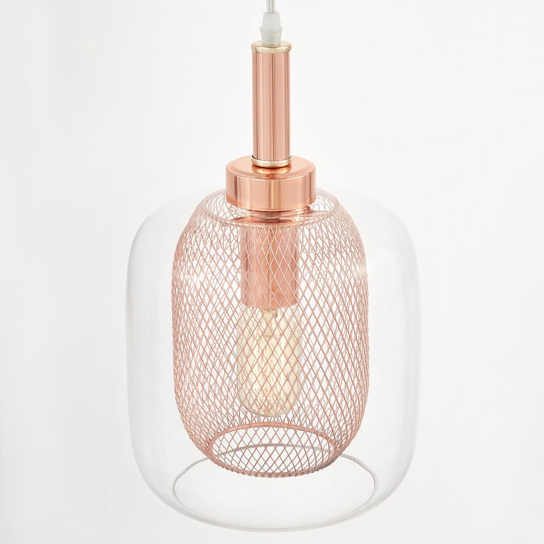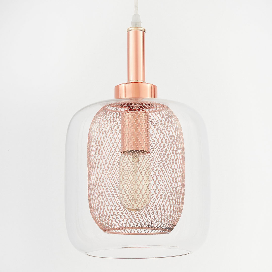 Veľmi trendová, moderná závesná lampa BESSA s ozdobnou sieťkou farby medi, ružového zlata a s priehľadným skleneným tienidlom. Tento typ závesného svietidla, lustra, sa hodí pre škandinávsky, loftový aj priemyselný štýl. Model sa teší veľkému záujmu.