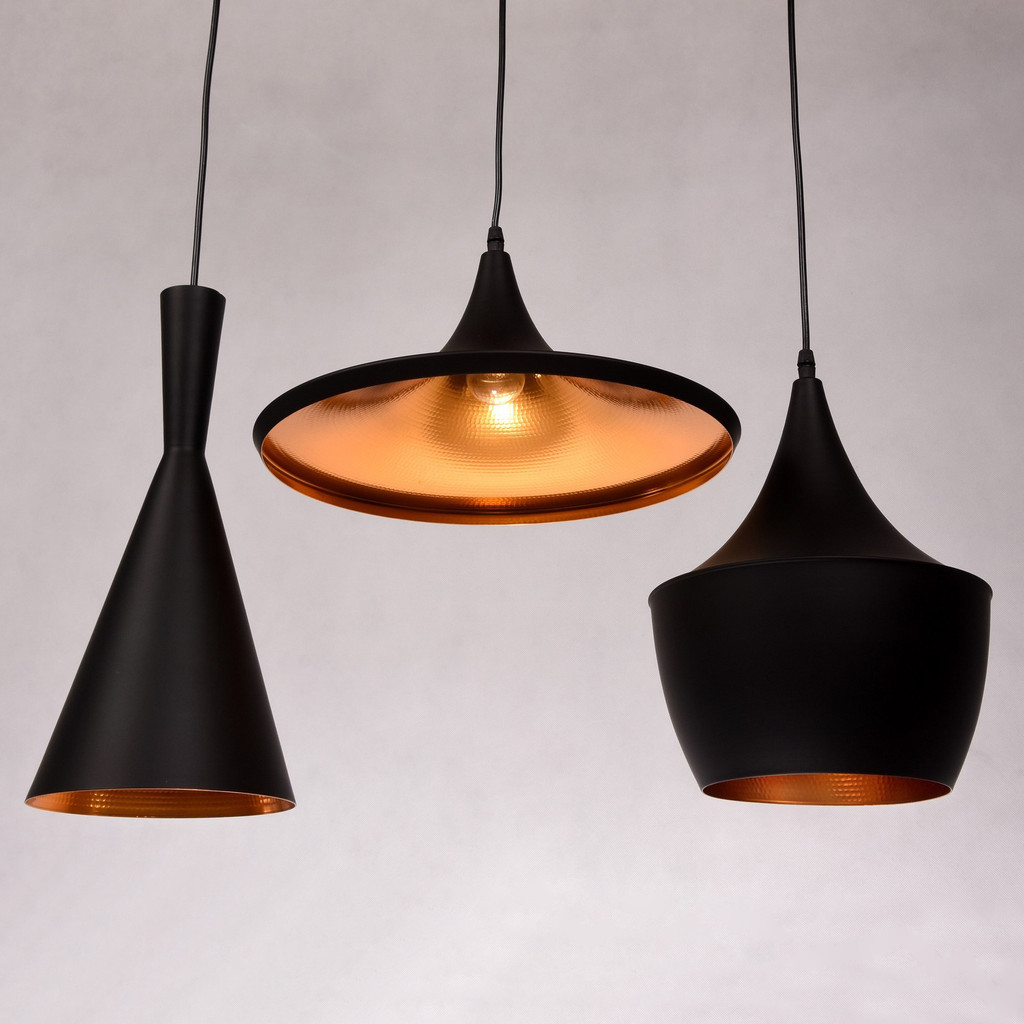 Dizajnová škandinávska loftová lampa FOGGI TRIO zložená z troch prvkov visiacich na rovnej lište. Moderný industriálny luster, dizajn v loftovom štýle. Závesné svietidlo vyrobené z hliníka s vonkajšou povrchovou úpravou v matnej čiernej farbe, zvnútra v zlatej farbe.