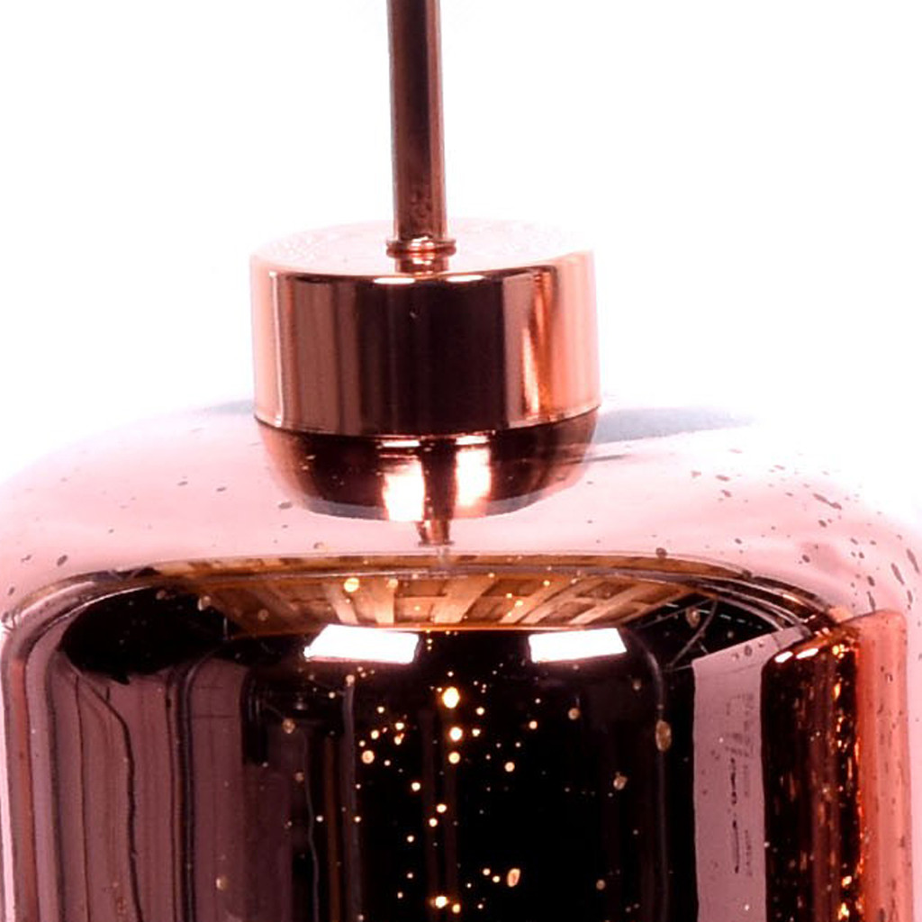 Trojité závesné svietidlo, moderný luster ALACOSMO s tromi sklenenými tienidlami vo farbe rose gold (ružové zlato) a kovovou stropnou lištou. Svetlo efektne prechádza bodkami viditeľnými na povrchu tienidiel. Pripomína tak žiaru hviezd.