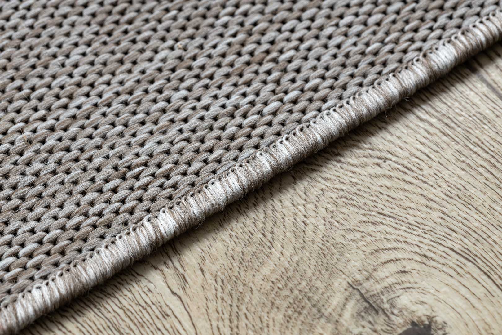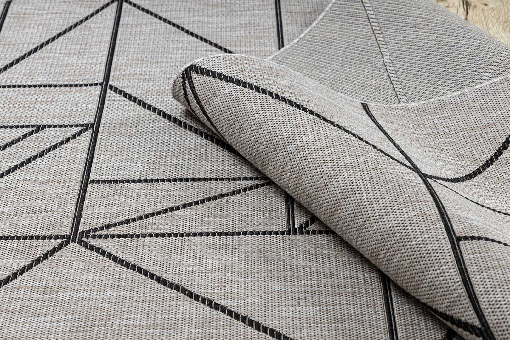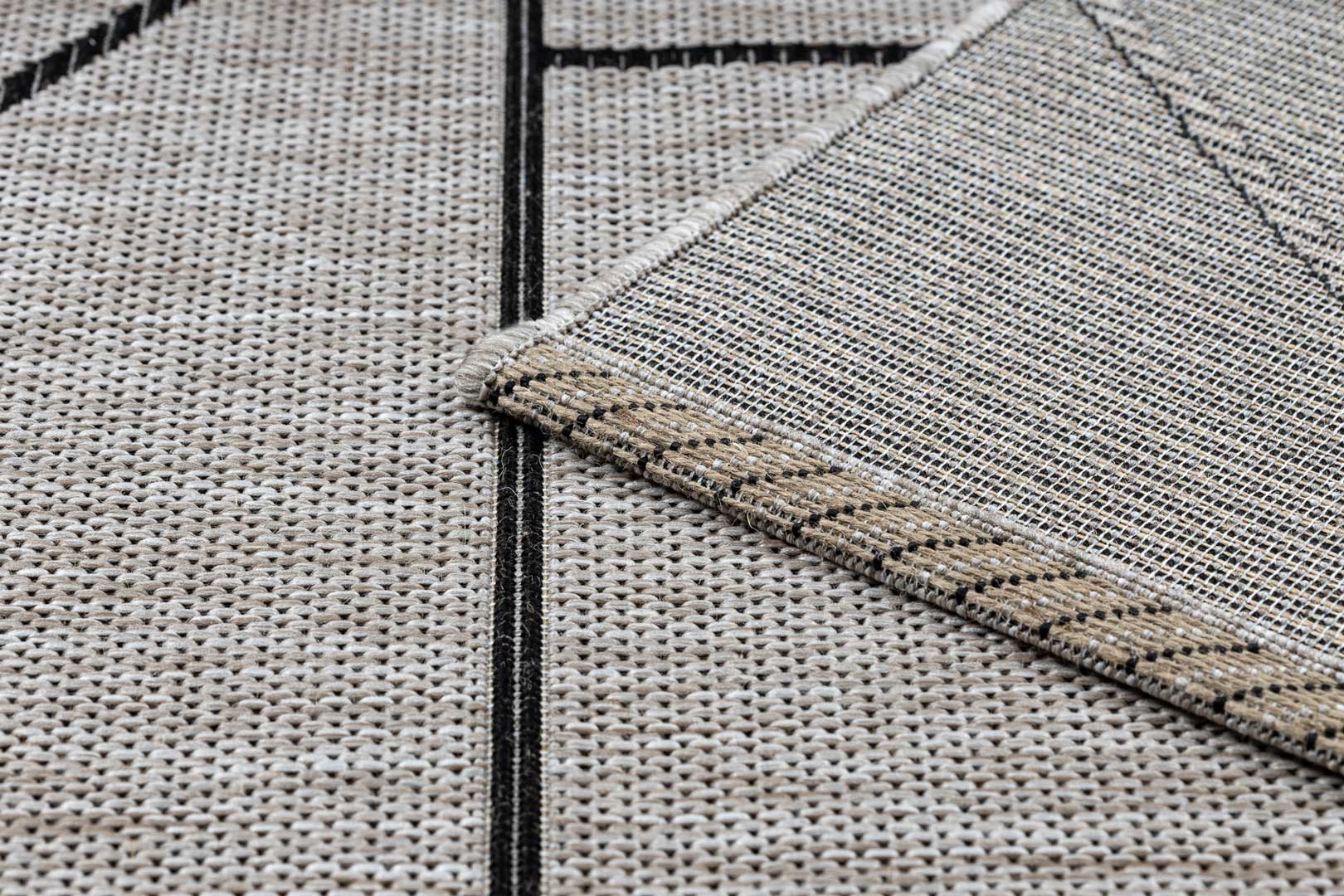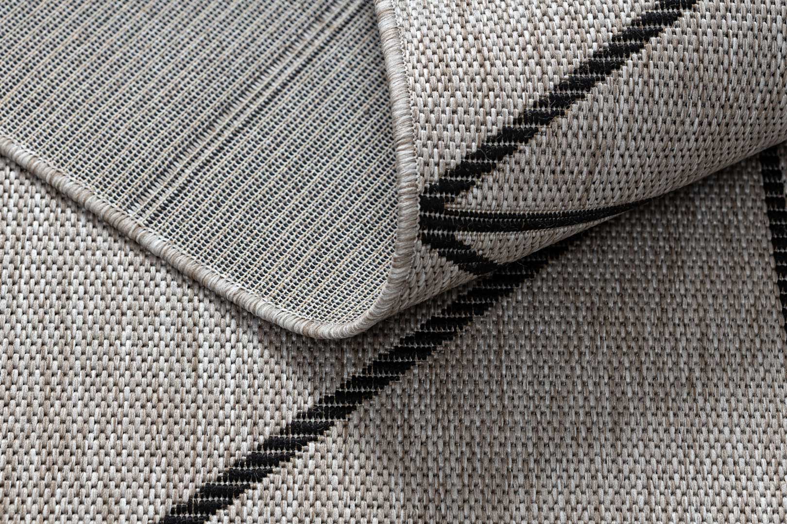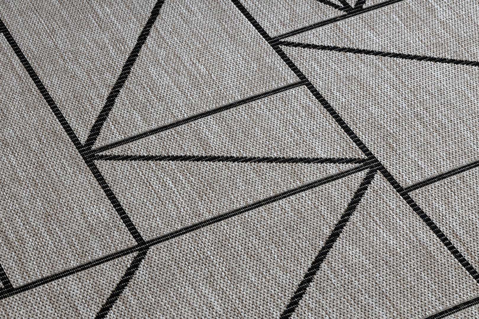 Sivý a béžový šnúrkový koberec s čiernym geometrickým vzorom trojuholníky, kosoštvorce, boho štýl, na terasu a do bytu - BOHANA